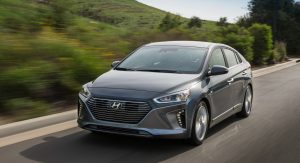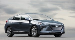 The Ioniq Plug-in Hybrid has the same internal combustion engine but it packs an 8.9 kWh lithium-ion polymer battery and a 60 HP (61 PS) electric motor, for an estimated electric driving range of more than 25 miles. Both the Hybrid and PHEV use the same 6-speed dual clutch transmission. Outside, it adds low-beam LED headlamps, a charging portal on the left front fender and different 16-inch alloy wheels.