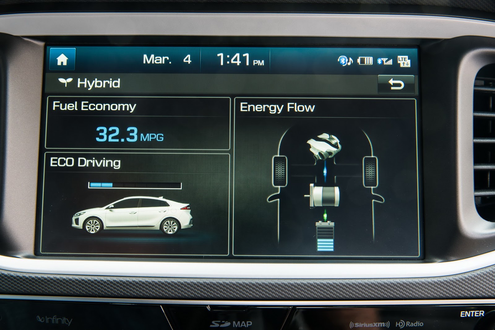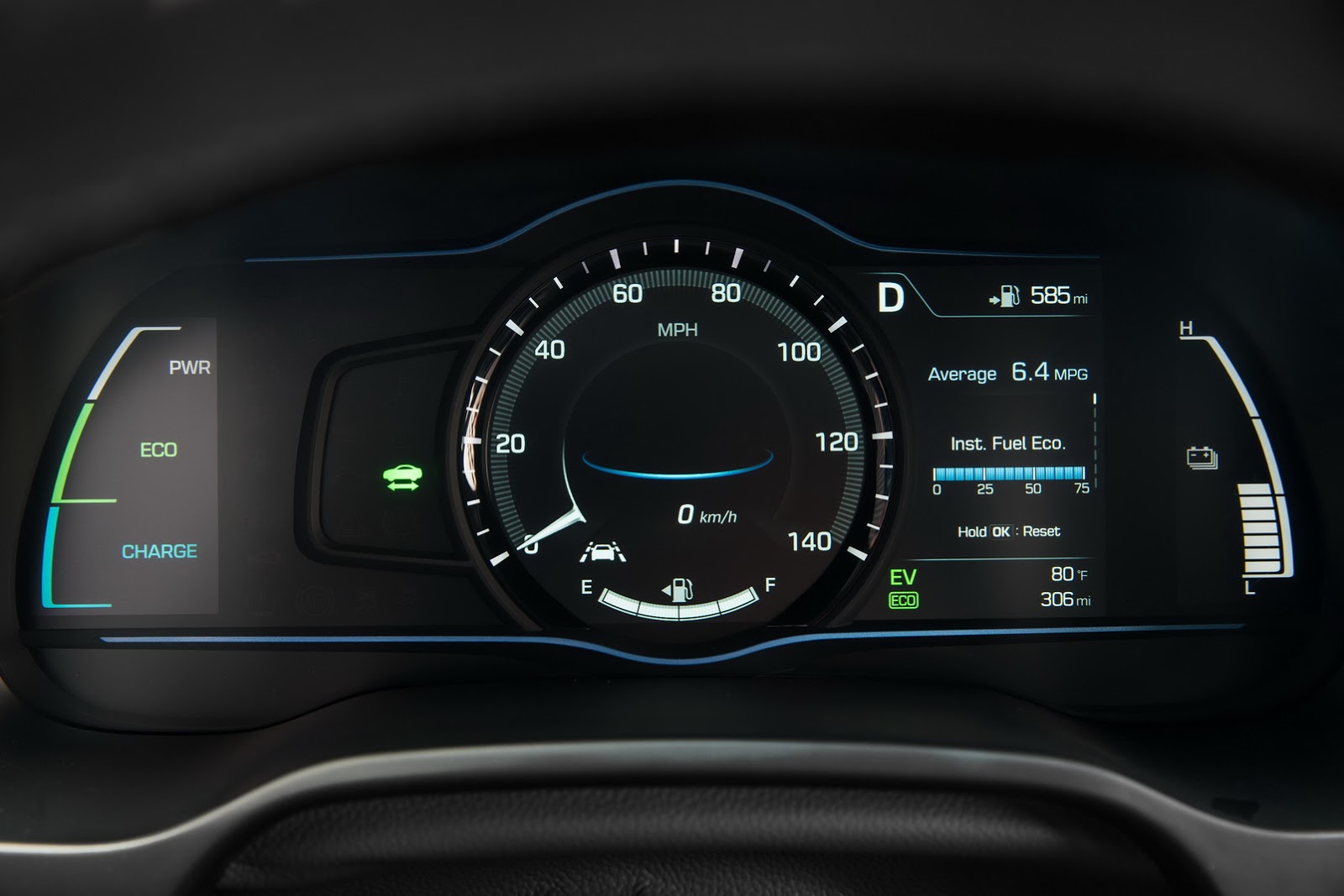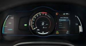 The Ioniq Hybrid is powered by a 1.6-kiter Kappa Atkinson-cycle four-pot mill with 104 HP (105 PS) and 109 lb-ft (148 Nm) of torque that’s paired to an electric motor that delivers 43 HP (105 PS) and 125 lb-ft (169 Nm) and a lithium-ion polymer battery, positioned under the passenger seats, for a total system output of 139 HP (141 PS).