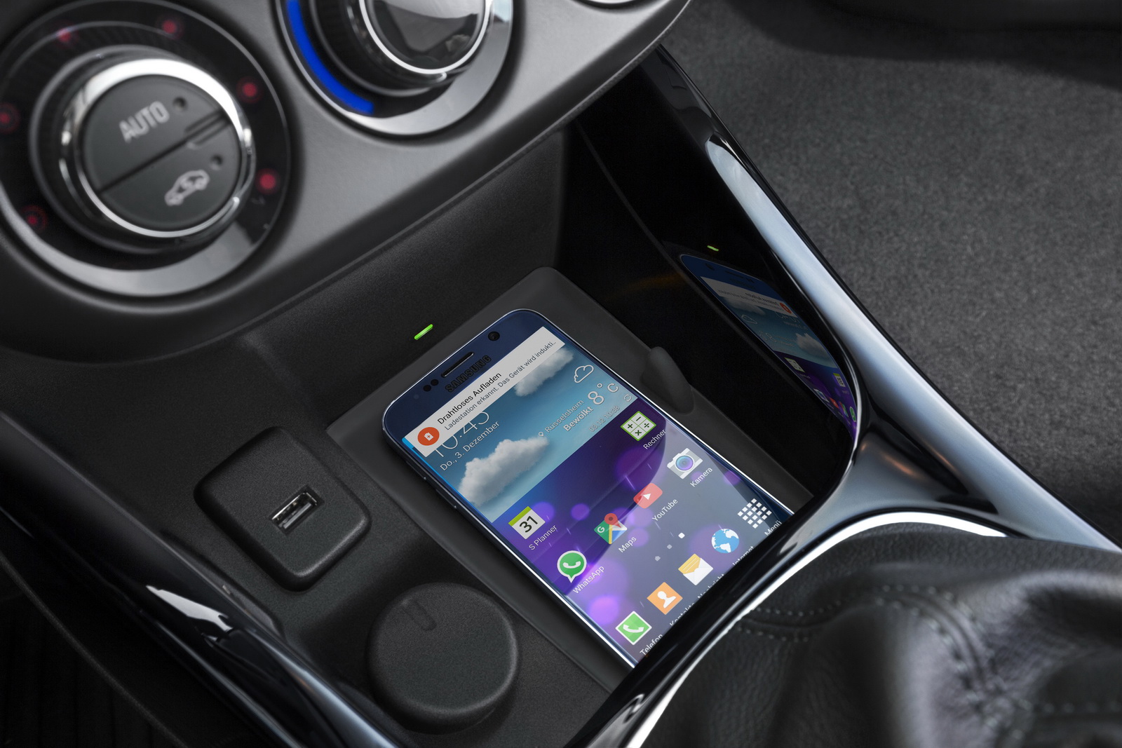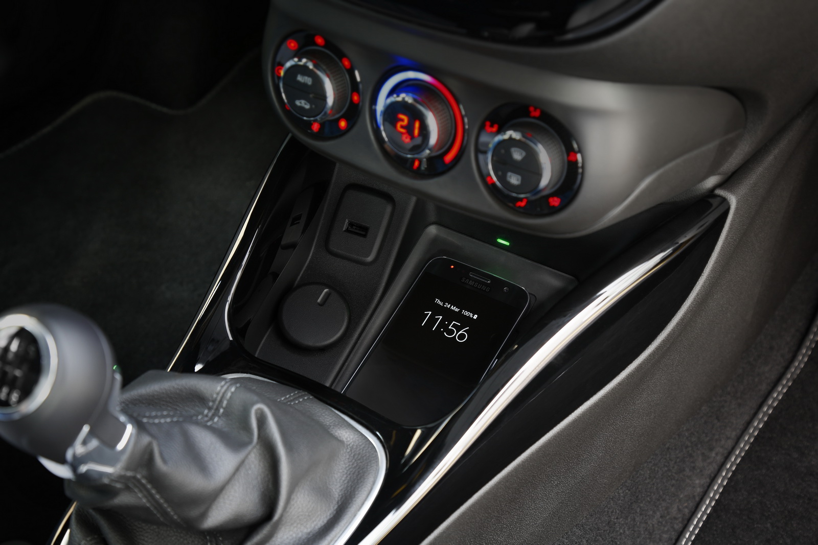 The charger is compatible with the “Qi” and “Powermat” interface standards and it has been fitted in the center console, right in front of the gear lever.