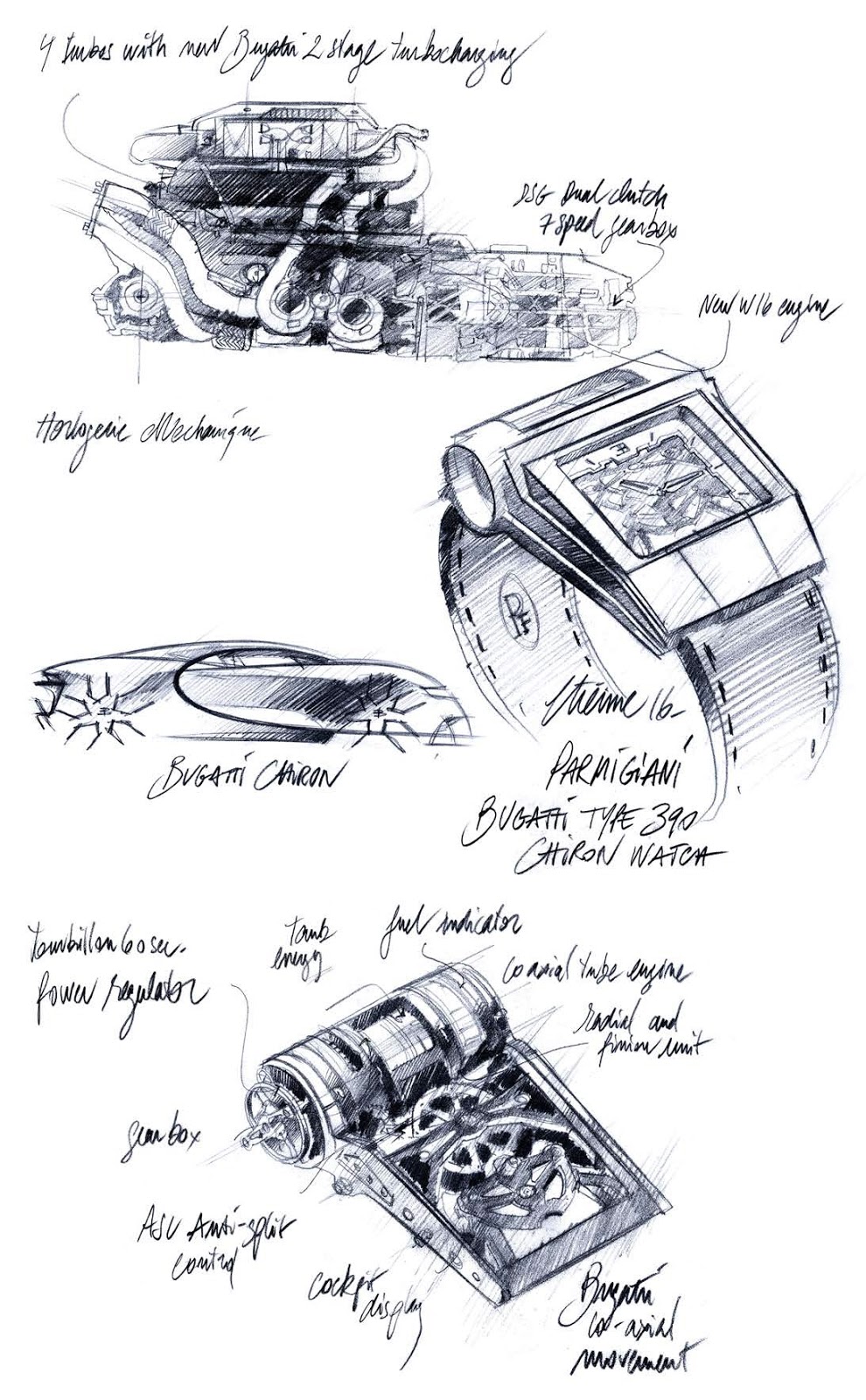 Now, with the unveiling of the brand-new Chiron, Parmigiani Fleurier announced its brand new watch series associated with the car, called PF-390 Concept Watch. Parmigiani says the chronograph is the representative of the new generation of Bugatti timekeepers, conceived as a motor-block on the wrist with a unique tubular movement with a tourbillon regulator at the end, making it (possibly) more complex than the vehicle’s quad-turbocharged W16. At the