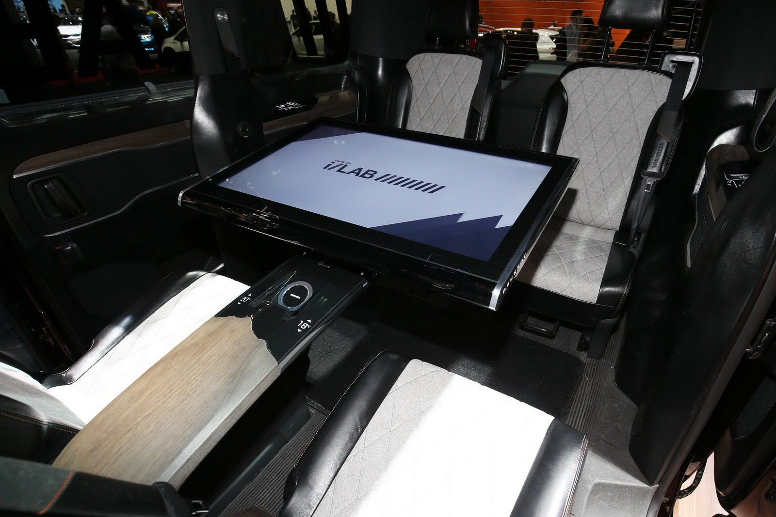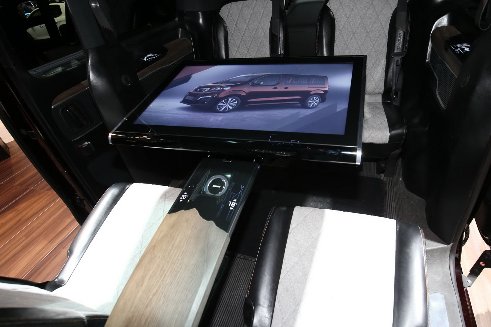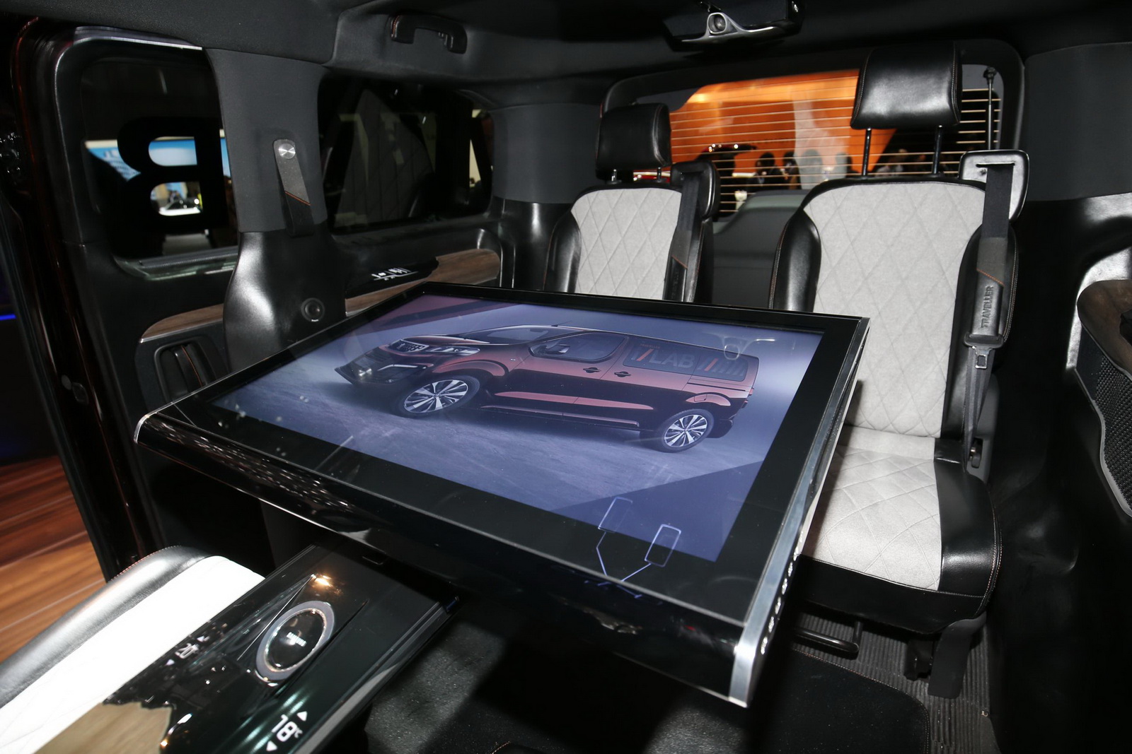 On the outside, nothing separates them (except maybe the tinted windows), but step into the i-Lab concept and you’re greeted by a high-tech lounge, composed of four comfy-looking leather and Alcantara seats, with a 32-inch touch tablet in the middle that can be positioned as preferred on the arch supporting it. Peugeot collaborated with Samsung in the development of the interior, as the screen, the Wi-Fi hotspot, the Bluetooth modules, the charging docks and the virtual reality headsets featured inside are made by the Korean company.