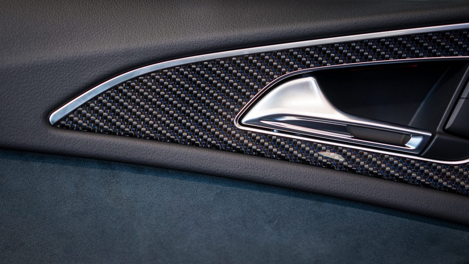 There’s Alcantara on the steering wheel, the gear shifter, door panels and roof line. The seats themselves are wrapped in Valcona leather whereas the doors, center console and dashboard share some carbon fiber bits. Also, there’s blue contrast stitching pretty much everywhere, which is natural seen as how it matches the car’s color theme.