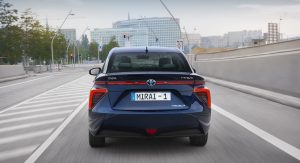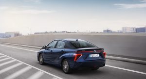 The Toyota Mirai uses hydrogen to generate electricity within a fuel cell stack and it emits just water. It has a total driving range of around 500 km (310 miles) and refueling its tank with hydrogen takes approximately 3 minutes.