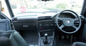 Painted in Glacier Blue, the bodywork is claimed to be 100 per cent rust free and does look straight as an arrow with all the trim present and overall in a very, very nice condition. The BBS cross-spoke alloys were always a perfect match for the iconic E30 shape, and these ones are recently refurbished according to the seller to reflect the rest of the car’s condition. The cabin also looks immaculate, with the cloth on the seats showing no signs of wear and the driver-focused dashboard still retaining its factory stereo and the analogue clock. We spotted some minor wear at the driver seat’s back but that’s about it. There is also an unused tool kit, warning triangle and a first aid kit in their original housing.