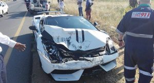 While the exact details surrounding the accident are still under investigation, from pictures taken at the scene and posted on Facebook by Netcare911, it looks like the Lamborghini rammed the Mazda on its side sending it toppling over on its head.
