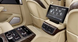 Inside, the longer Audi A8 L has seating for six, upholstered in extra-supple Valcona leather, finished in velvet beige. The second and third rows have electrically adjustable individual seats, and the final row features a continuous center console, a cool box and a Rear Seat Entertainment display.
