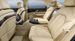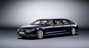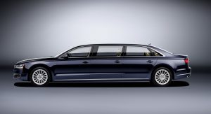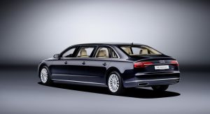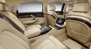 Tipping the scales at 2.418 kg (5,331 lbs), the Audi A8 L Extended is powered by a 3.0-liter TFSI petrol engine, rated at 310 PS (306 HP) and 440 Nm (325 pound-feet) of torque, sent to the quattro permanent AWD system through an 8-speed tiptronic gearbox. Accelerating from 0 to 100 km/h (62 mph) takes 7.1 seconds and top speed has been electronically limited to 250 km/h (155 mph). Deceleration is said to be “outstanding”, as the car’s brakes are concealed by the 19-inch wheels, with a 15-spoke pattern.