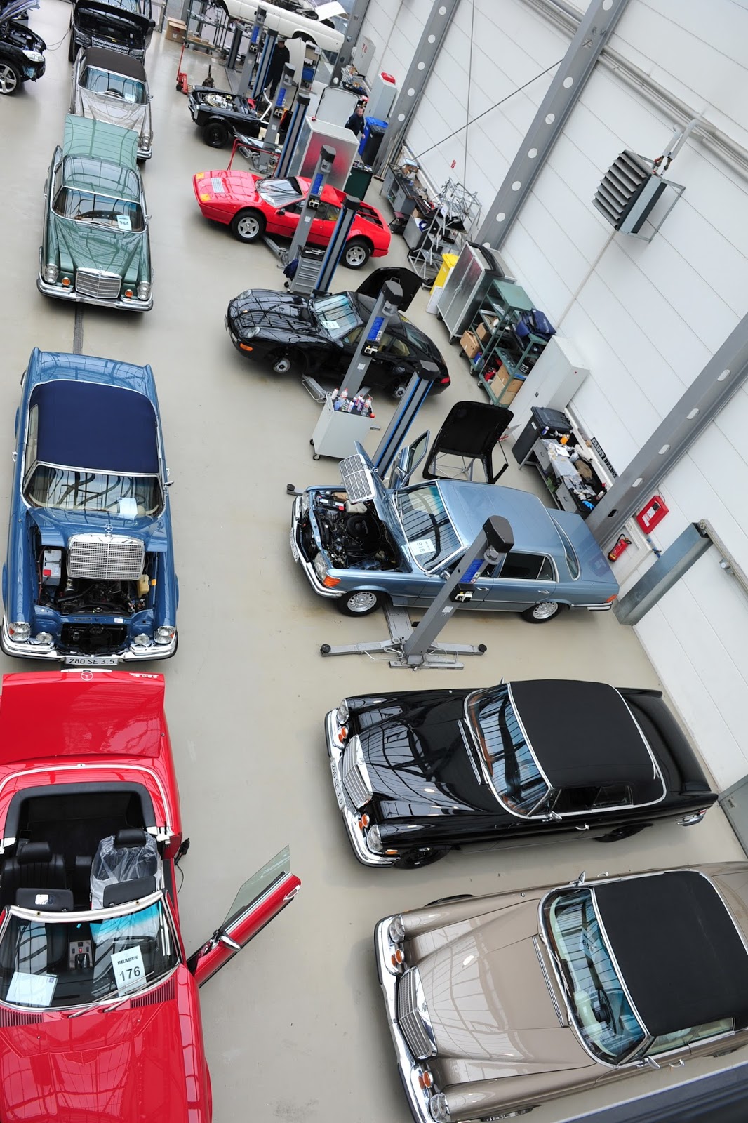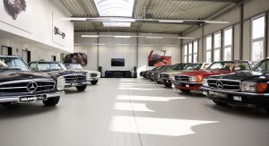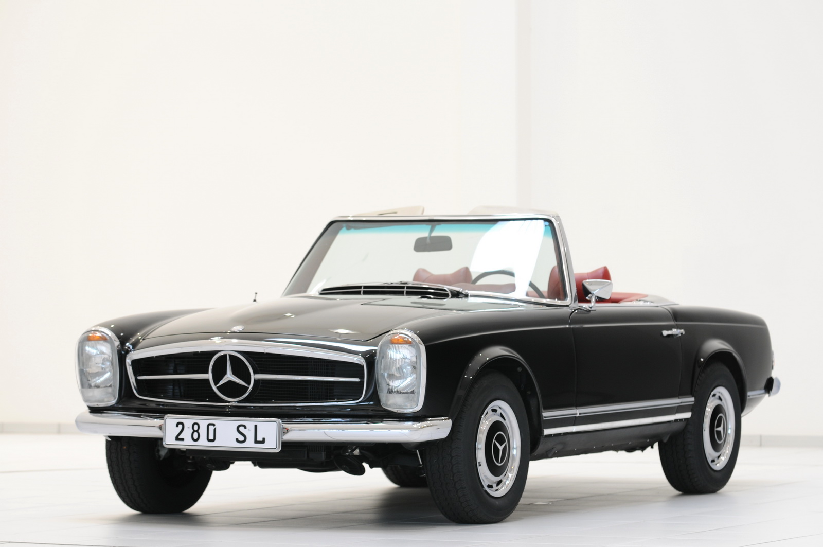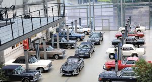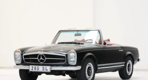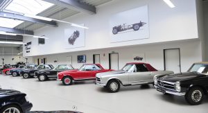 The automobiles presented at Essen are three 280 SE 3.5 Cabriolets, two 280 SL “Pagode” models, a 300 SL Roadster paired with its hard-top sibling, the 300 SL Gullwing, and a 600 Pullman.