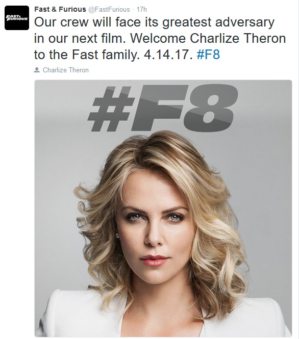 The F&F twitter feed broke the news, saying that “Our crew will face its greatest adversary in our next film. Welcome Charlize Theron to the Fast family.”