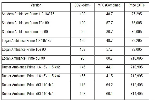 The Ambiance Prime versions of the Dacia Sandero and Logan MCV are available with the 75hp 1.2-litre, the 90hp turbocharged 0.9-litre or the 90hp 1.5-litre dCi diesel engine. The special Duster is available with either the 115hp 1.6-litre petrol or the 110hp 1.5-litre dCi diesel engine, both in front- and all-wheel drive configurations.