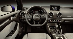 Big news on the outside is the addition of Matrix LED headlights for the A3 in the newly sharpened light housings. Xenons are now standard fare on the A3, with normal LED lights the upgrade. A grille that’s seemingly lifted off of the A4 sits between the lights. There are also five new exterior colors, according to Audi, bringing the roster of choices up to 12.