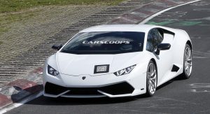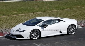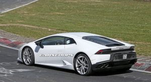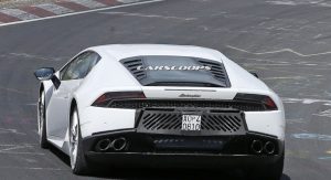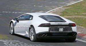 This is the second time we’ve spied the Huracan mule, and as before, the main difference over the stock models is a box that’s used to mask the relocated exhaust pipes, as according to our man on the field, the four outlets on the white tester were fake. Our spy also reported that the car sounded way more aggressive on the track than the plain Huracan.