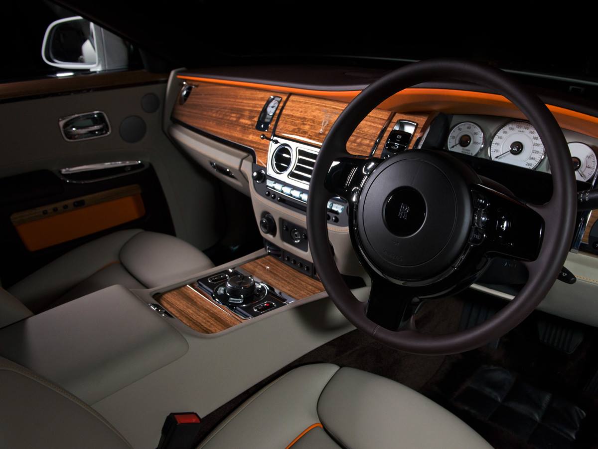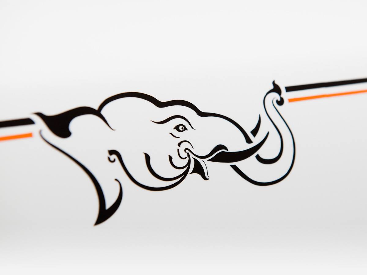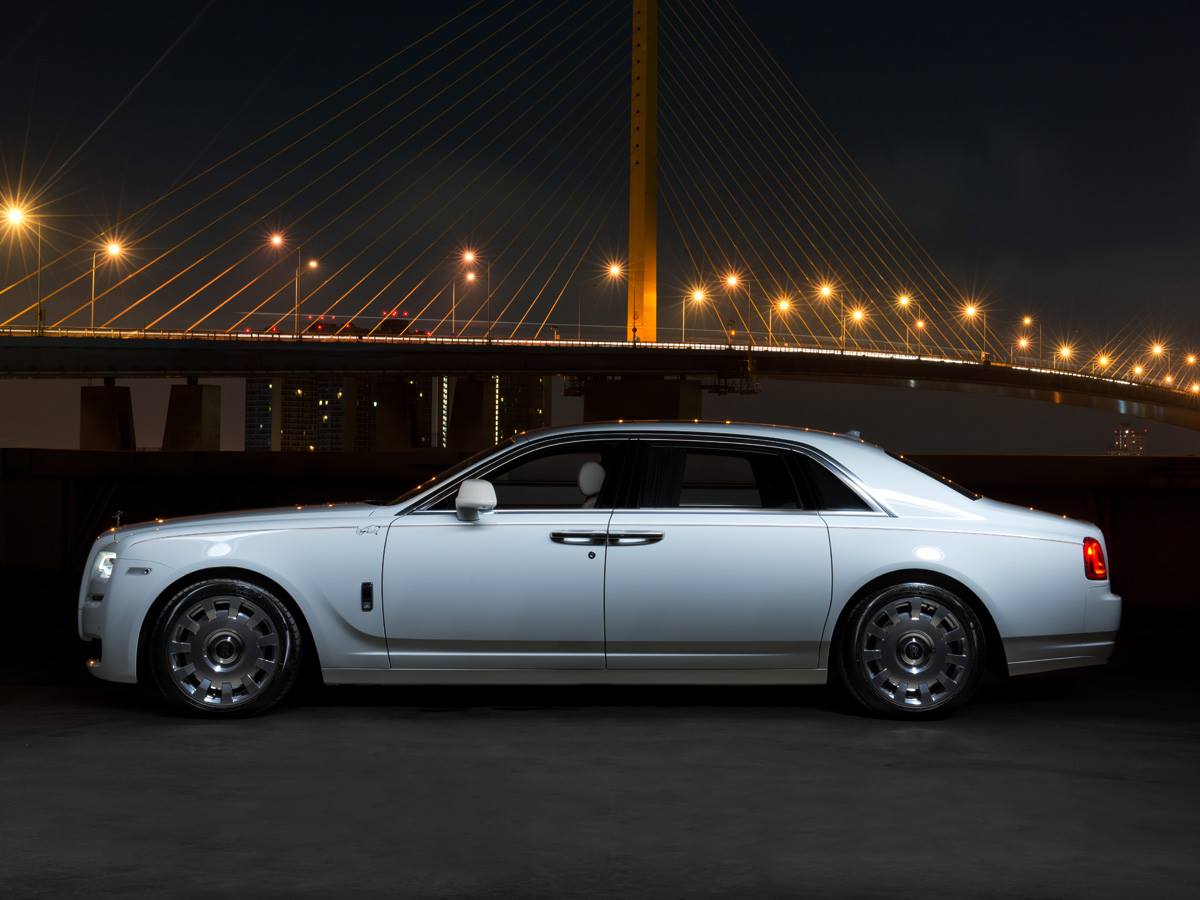 Named the KoChaMongKol Ghost Extended Wheelbase, the vehicle’s English White exterior represents a perfect canvas for the bespoke black and orange Mandarin pinstripe, complemented by the elephant motif detailing.