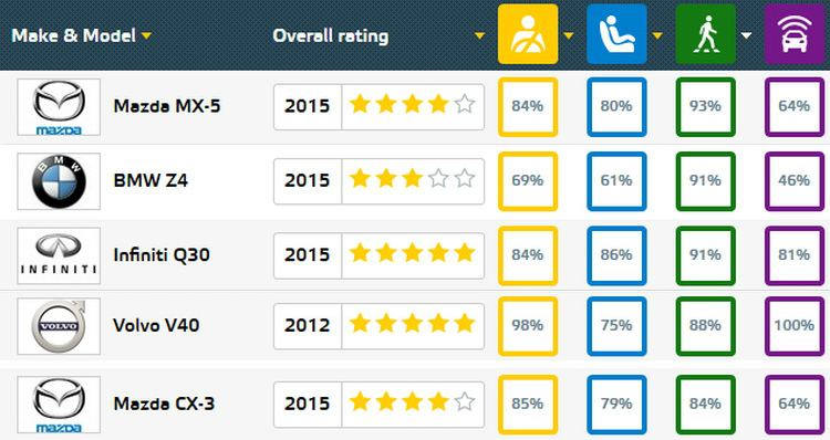 Mazda certainly did very well for themselves with the MX-5, CX-3 and the Mazda 2 (identical score to the CX-3). Nevertheless, the Infiniti Q30 and the Volvo V40 are the only cars in the Top 5 that have been awarded an overall 5-star rating from EuroNCAP.