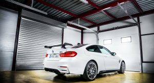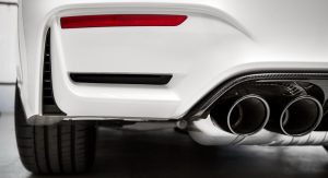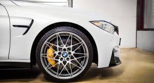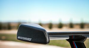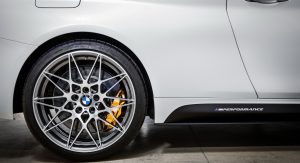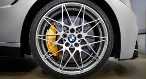The M4 CS also has carbon-ceramic brakes from the M4 GTS, which help reduce weight by 6.5 kg (14 lbs). The standard 20-inch alloy wheels are also lifted from the GTS, only with in a silver finish, . All units benefit from the adaptive M chassis and differential, at no extra cost, and are set apart furthermore by the M Performance parts that count front spoiler lip, side skirts, side mirror caps, rear diffuser and rear wing, all made from carbon fiber.
