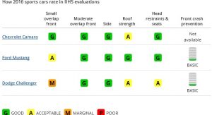 The closest to earning a Top Safety Pick was the Mustang, with the Camaro falling short in one category, lacking an available front crash prevention system while also having a lower rating for roof strength, and the Challenger was the “most in need of improvement”, according to the IIHS.