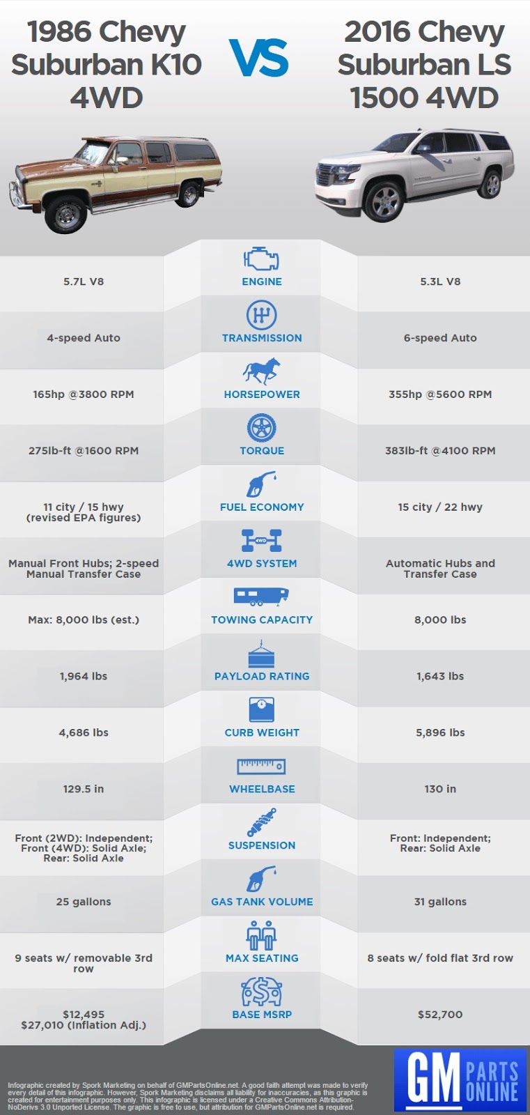“The new Suburban is one of my favorite Chevrolet vehicles, but I think it’s fair to say the Suburban’s asking price has exploded since 1986,” said Gib Goodrich of GMPartsOnline. “Our comparison shows a 95% increase in MSRP, even after we adjust for inflation. While some of that price increase is explained by the 2016 model’s superior fuel economy, engine power, and safety ratings, it’s hard for me to understand the price almost doubling.”