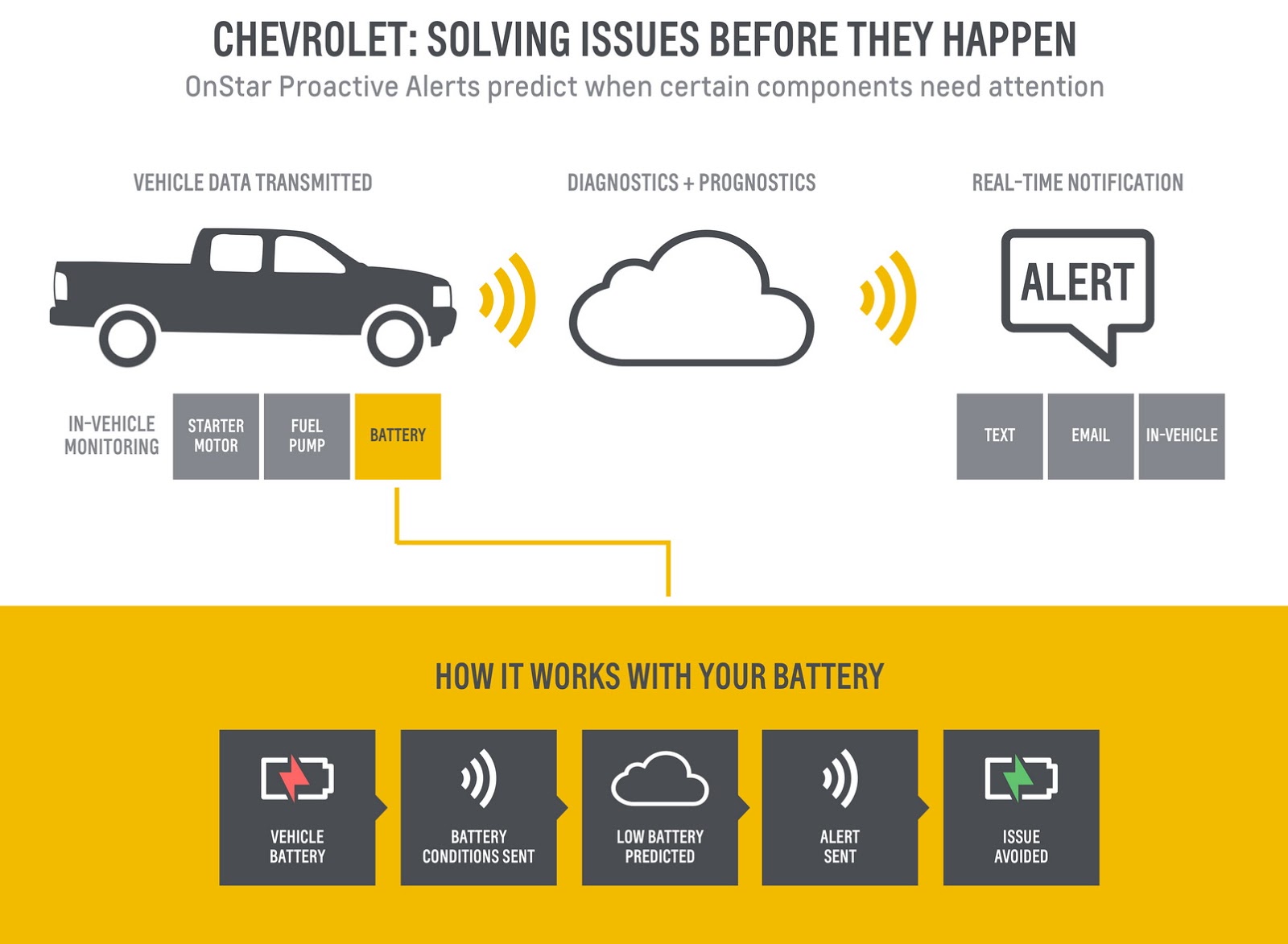 Every time one of the previously mentioned Chevy vehicles is started, Proactive Alerts collects a small batch of data and monitors it on a continuous basis. What follows is a rather sophisticated system analysis of billions of pieces of data – accumulated across the fleet of vehicles.