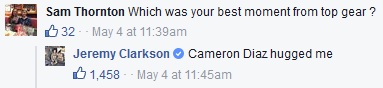 “Cameron Diaz hugged me“, Clarkson said when asked about his favorite Top Gear moment, during a Q&A on Facebook.