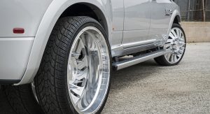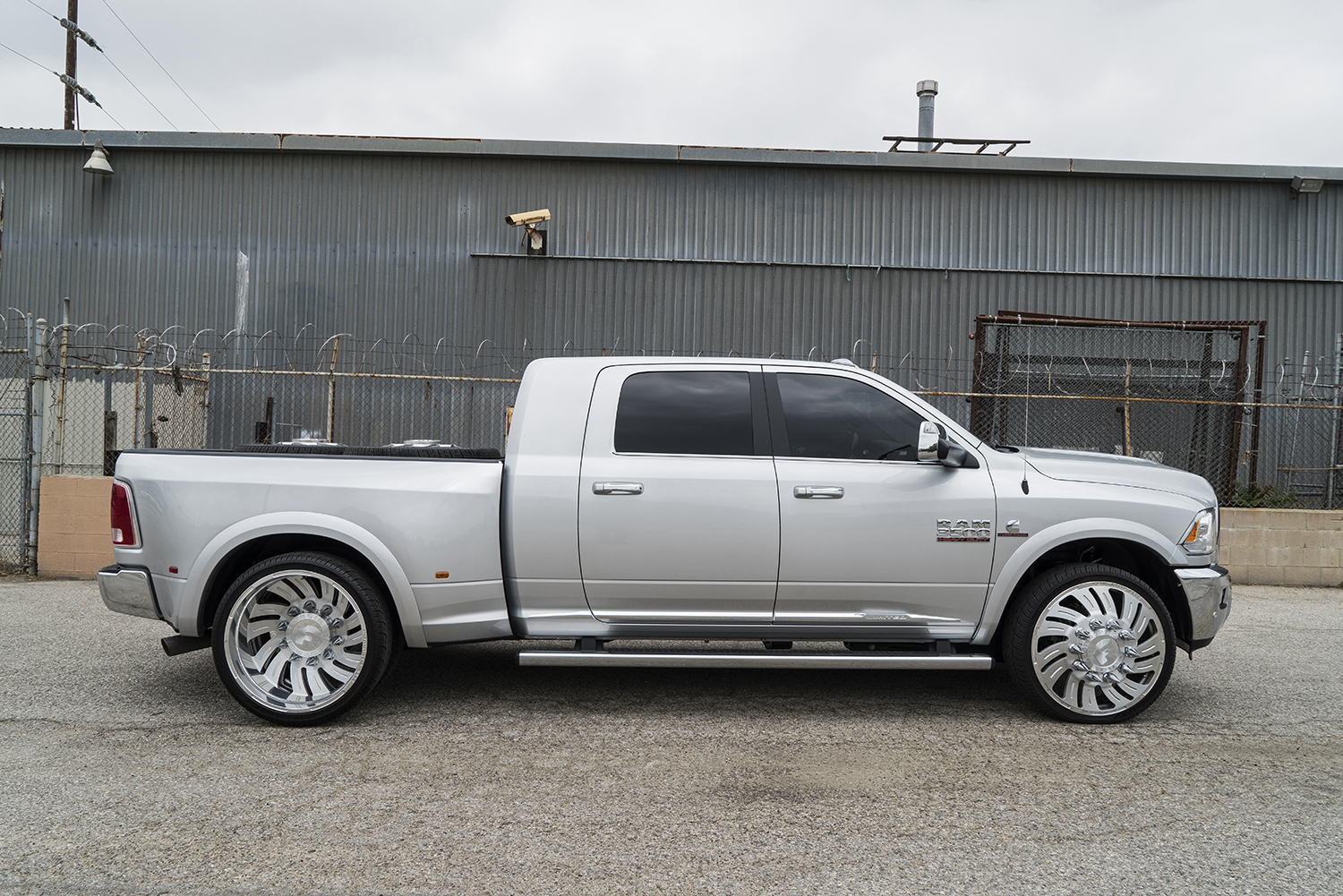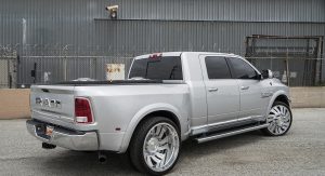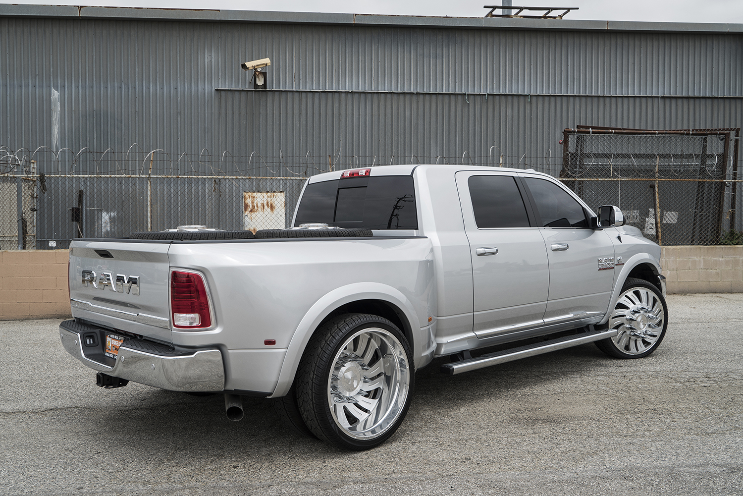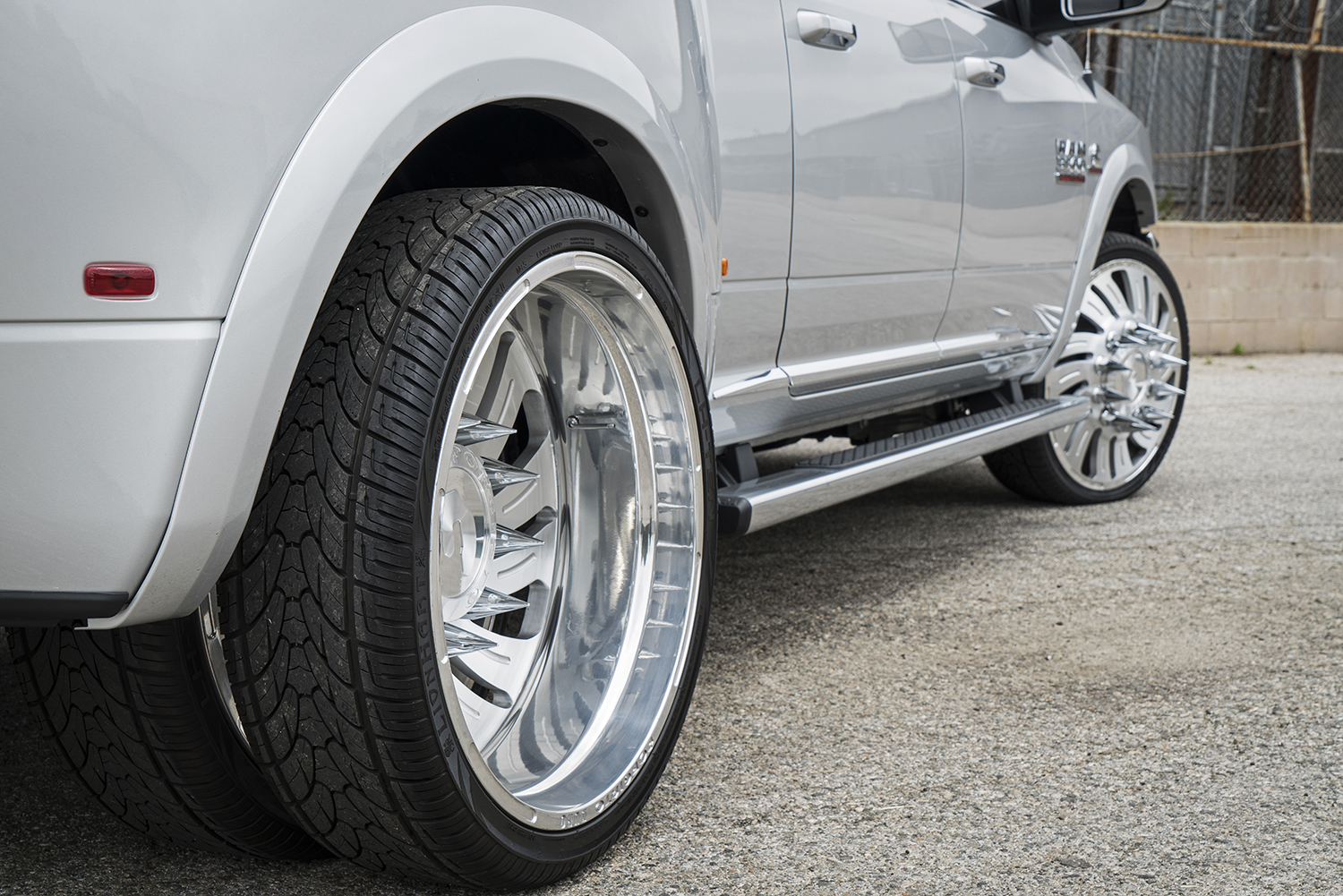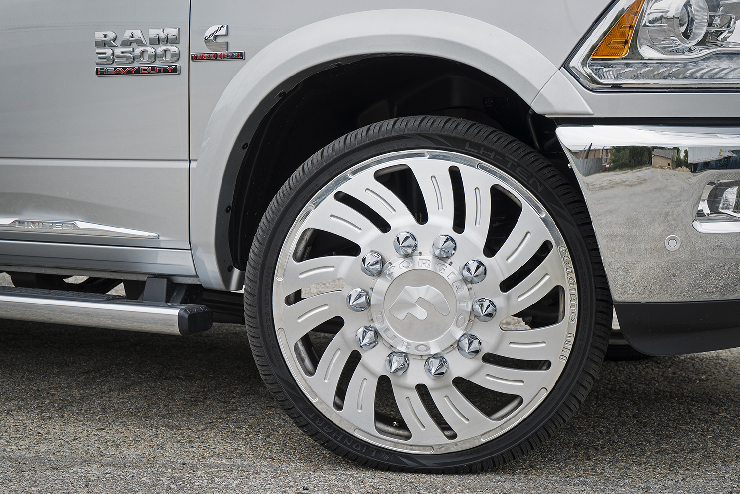 The custom wheels are made by Forgiato and feature a spinning design like every one from the Duro Dually collection made specifically for the heavy duty truck market, where we often see dual-wheel setups at the rear.