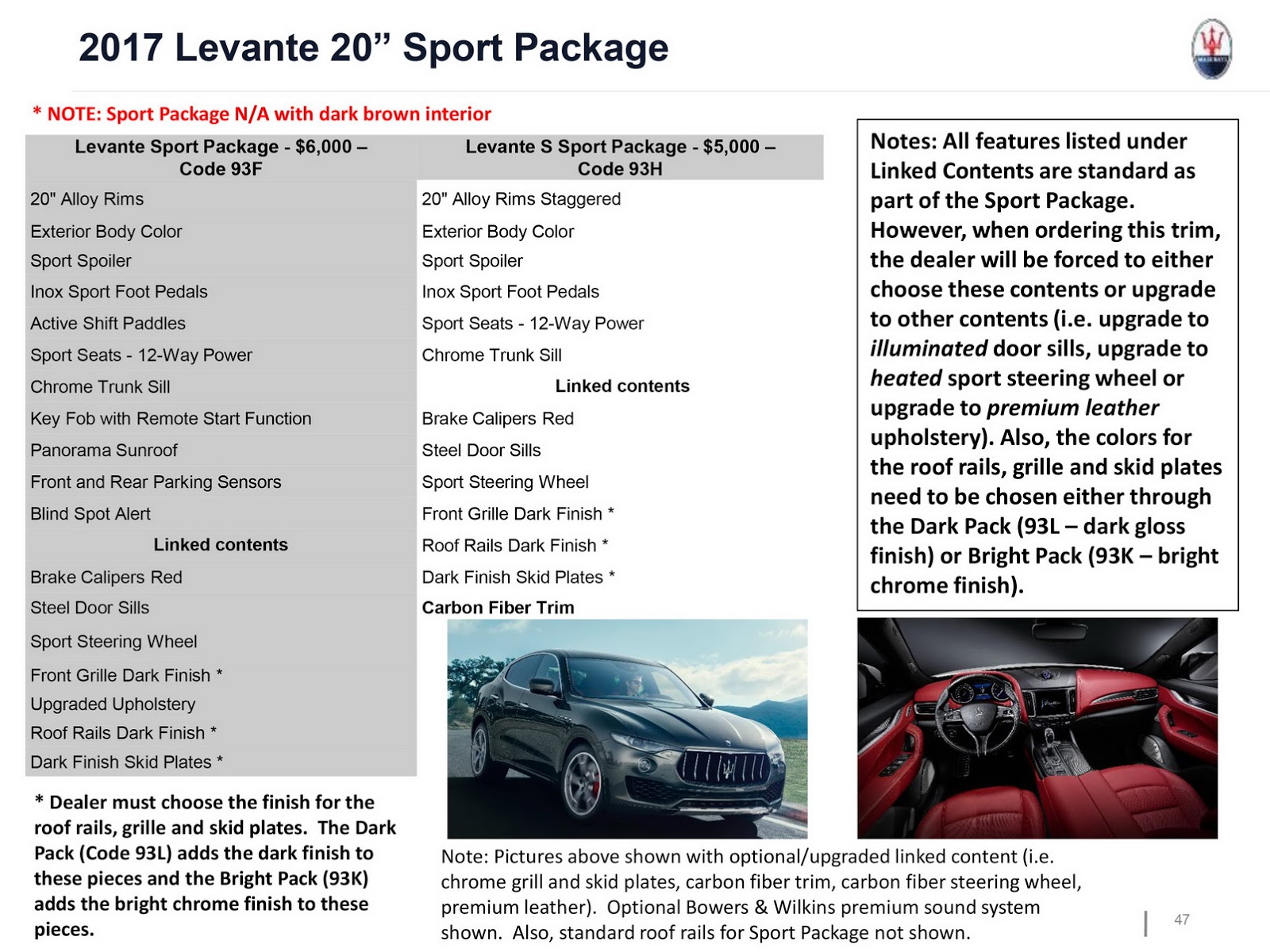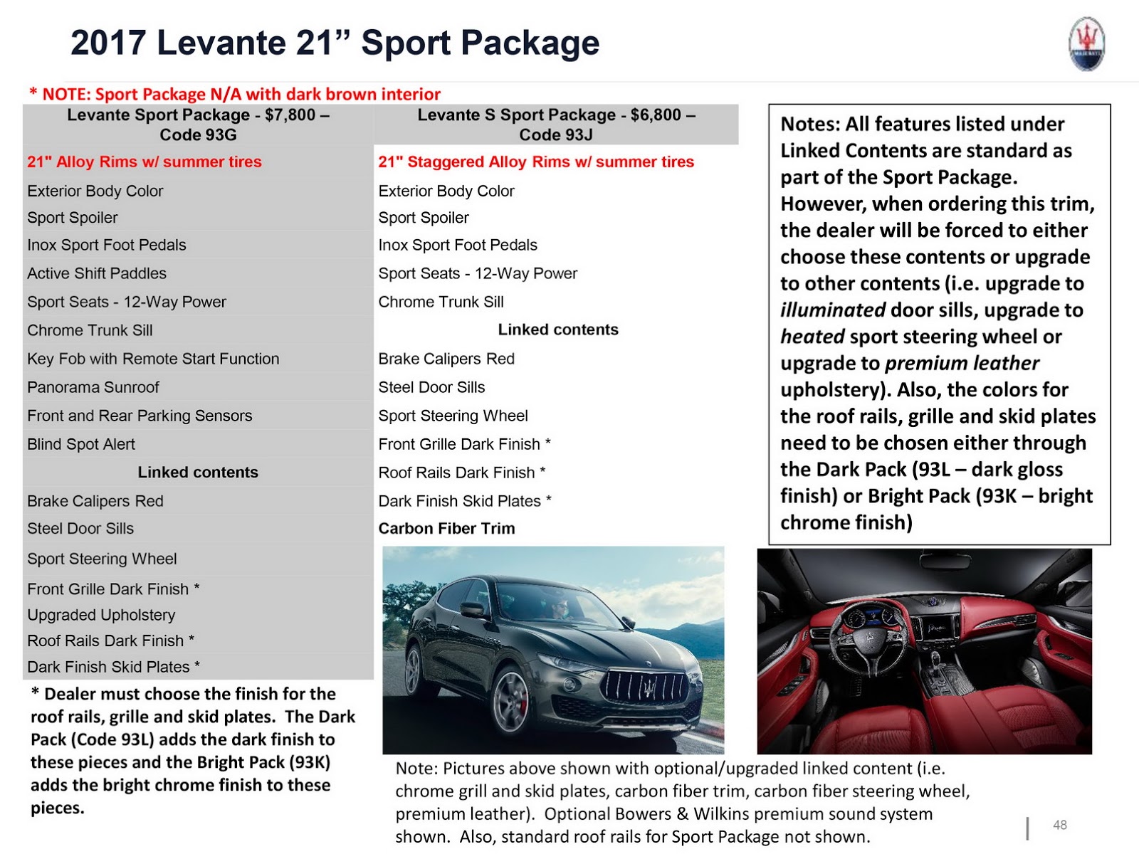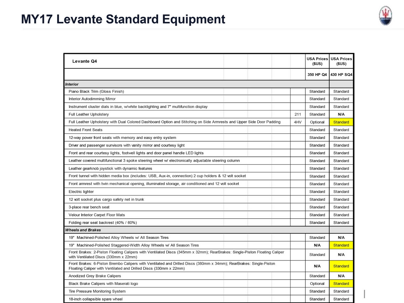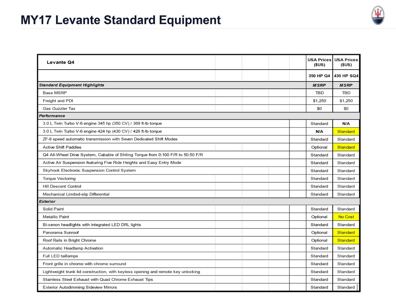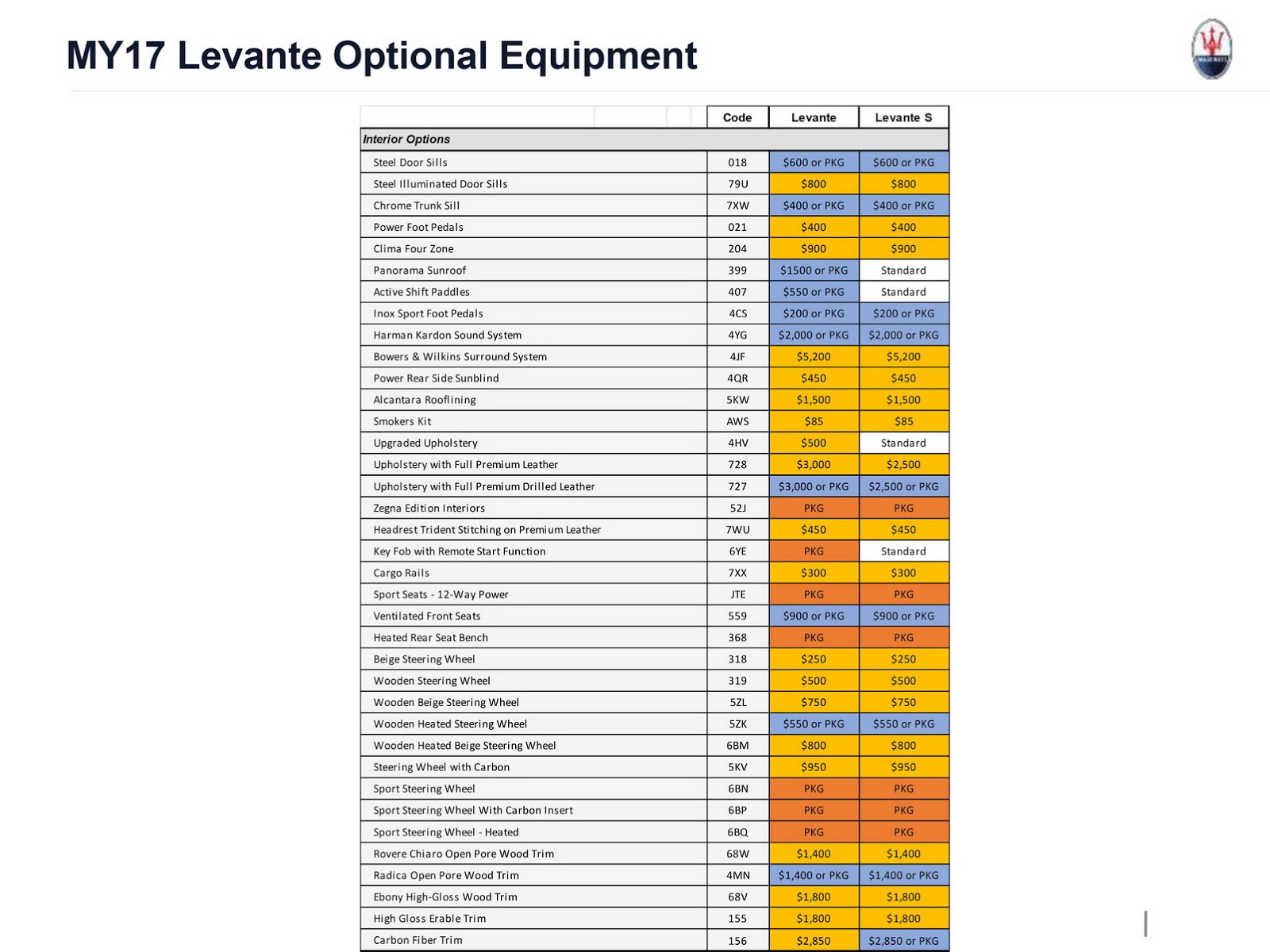 What Maseratilevanteforum member Maserati_Matt offers us today is the preliminary dealer ordering guide that gives us an insight on what the Italian brand plans to charge for various extras, packages and such – though, keep in mind that these are believed to be estimates, not final prices.