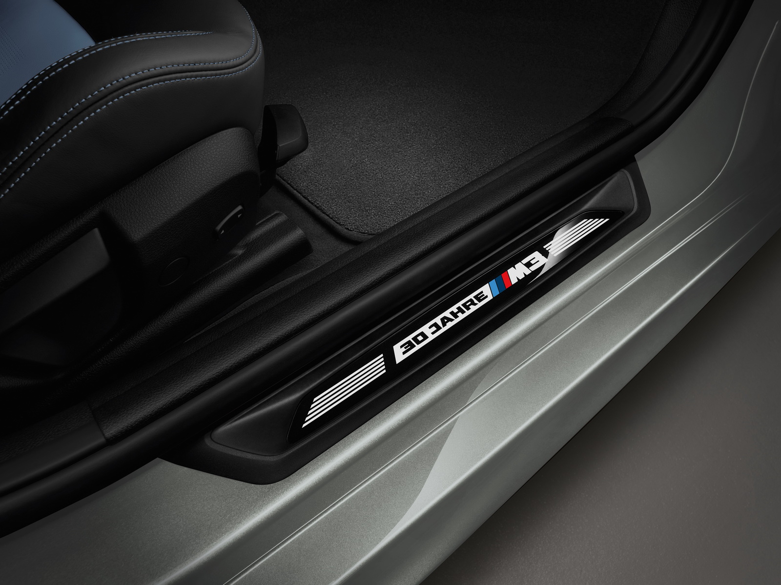 Inside, the M3 30 Jahre (M3 30 Years) receives special embossed logos on the front seat headrests, carbon fiber trim, black and blue Merino leather upholstery, Alcantara-wrapped steering wheel and gear selector surround and “30 Jahre M3” logos on the door sill finishers.
