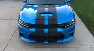 What do you think about the end-result? Black and blue don’t always work well together, but Dodge’s Blue Pearl exterior color doesn’t seem to interfere much with the darker stripes.