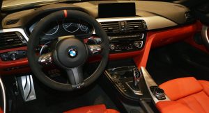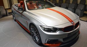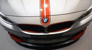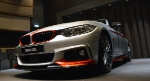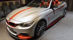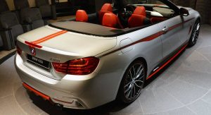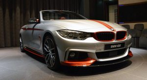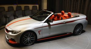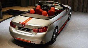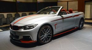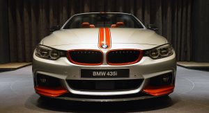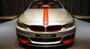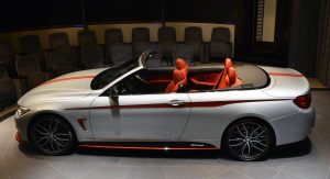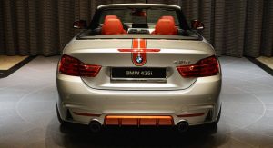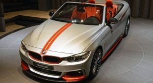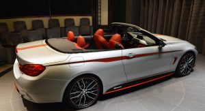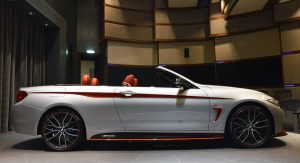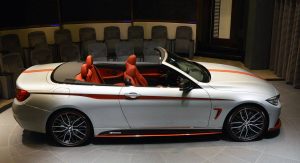 This convertible 435i, which which comes courtesy of the company’s Abu Dhabi dealership, has a lot of extra kit on it, from the M Performance bits, orange stripes, rear diffuser, front spoiler and kidney grille to the M-badged steering wheel and orange interior.