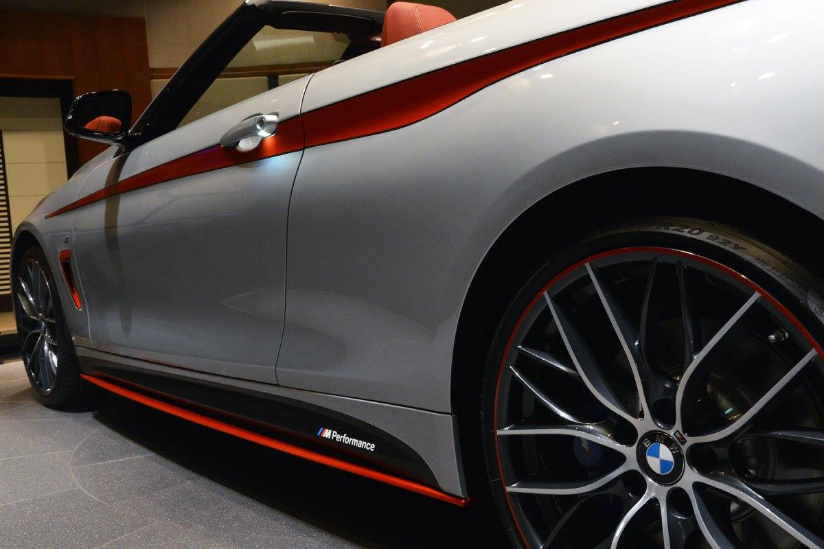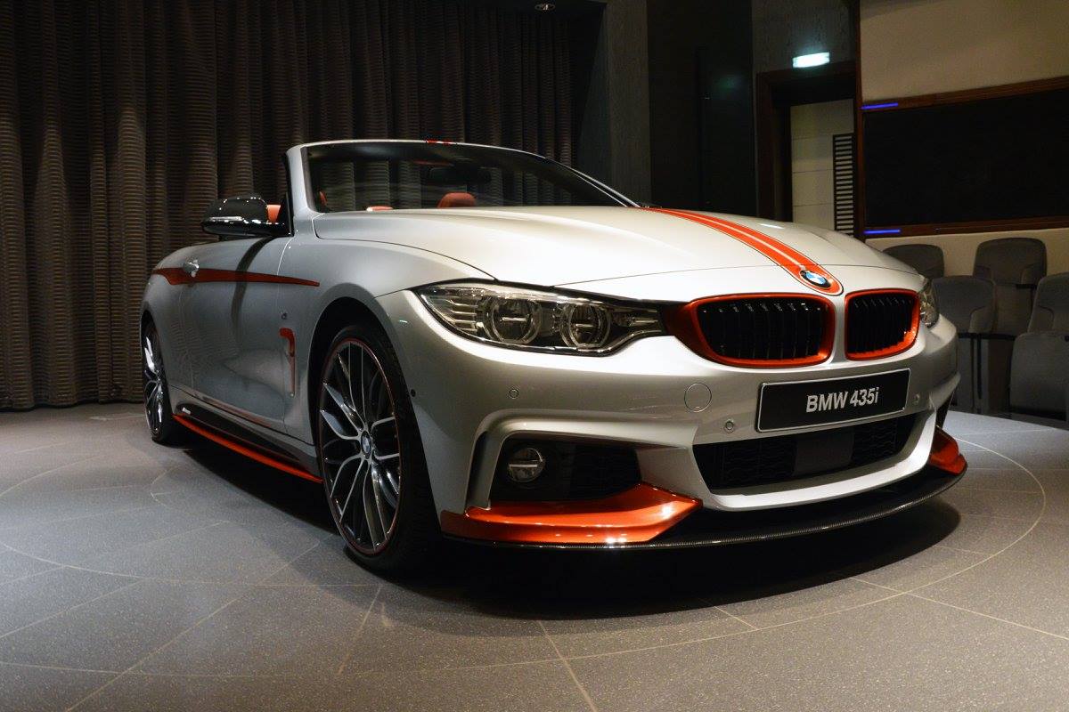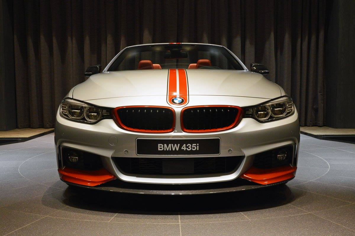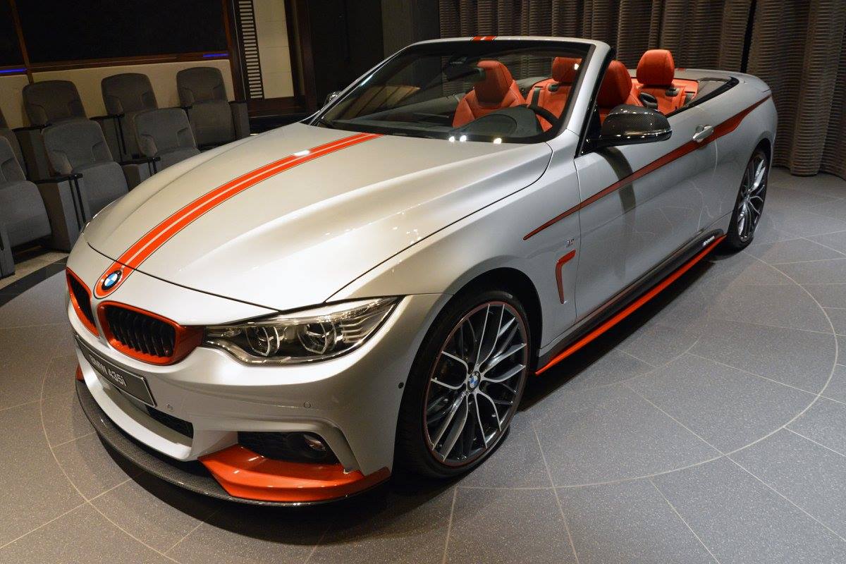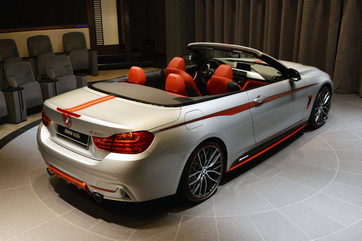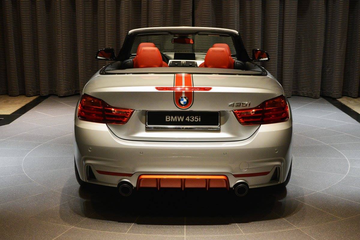 This convertible 435i, which which comes courtesy of the company’s Abu Dhabi dealership, has a lot of extra kit on it, from the M Performance bits, orange stripes, rear diffuser, front spoiler and kidney grille to the M-badged steering wheel and orange interior.