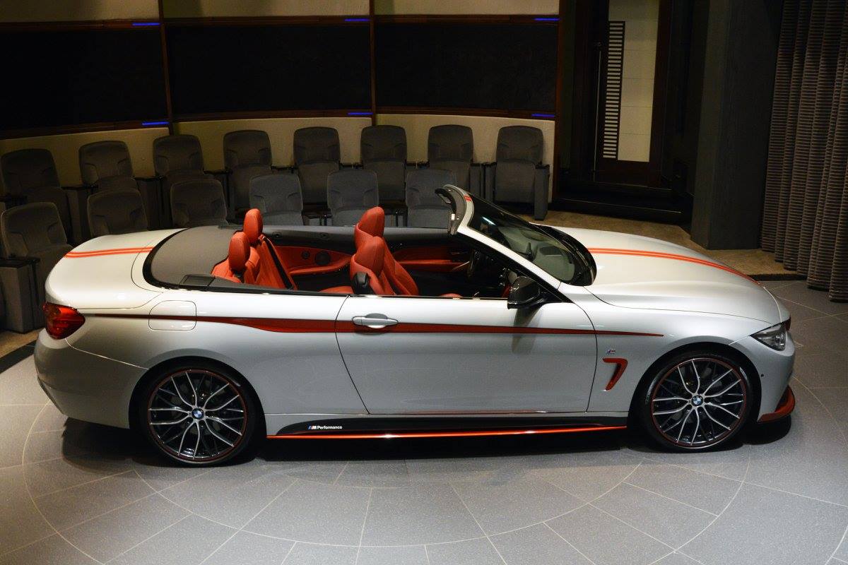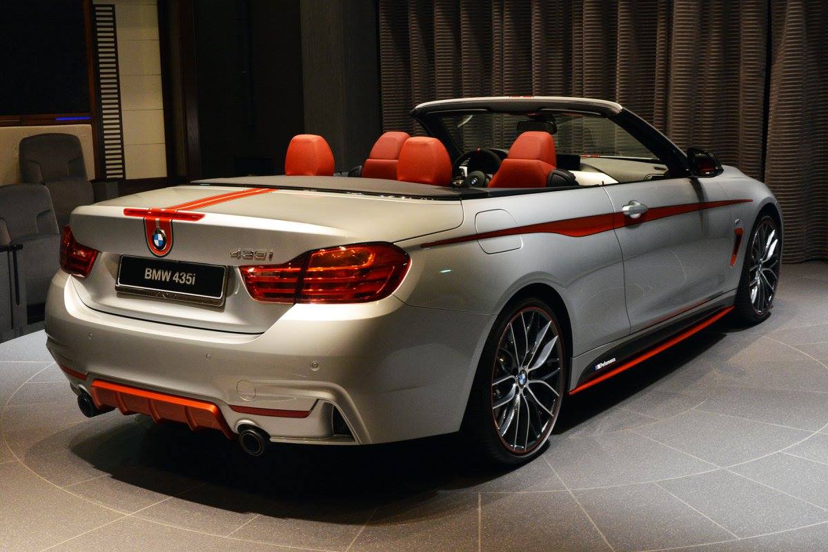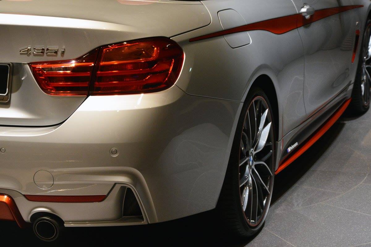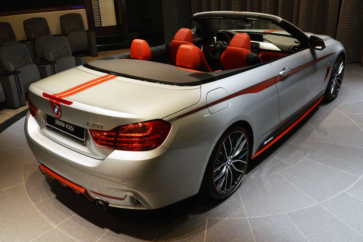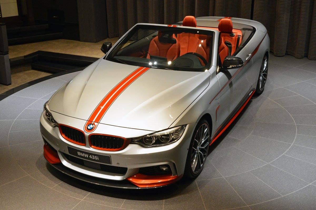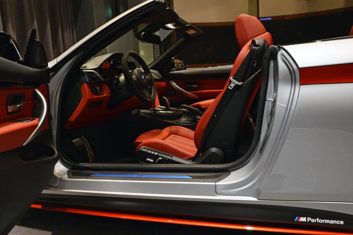 This convertible 435i, which which comes courtesy of the company’s Abu Dhabi dealership, has a lot of extra kit on it, from the M Performance bits, orange stripes, rear diffuser, front spoiler and kidney grille to the M-badged steering wheel and orange interior.