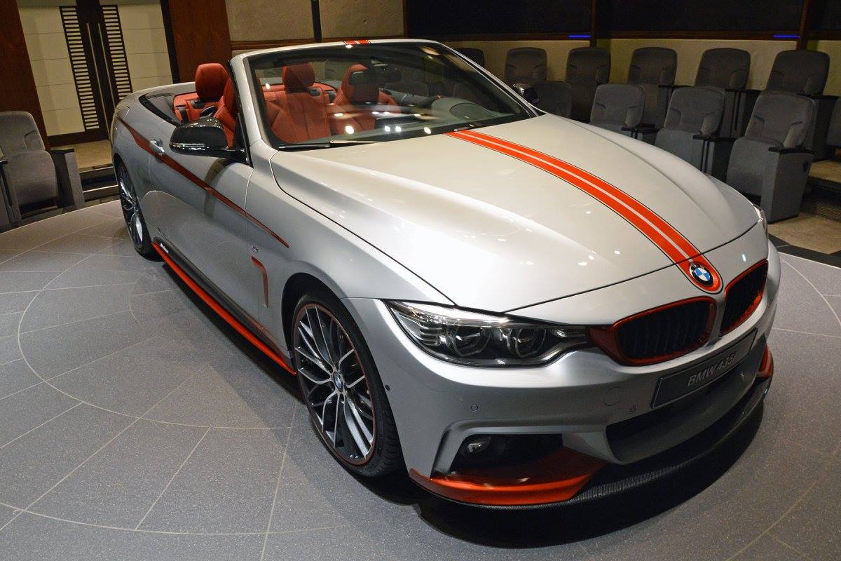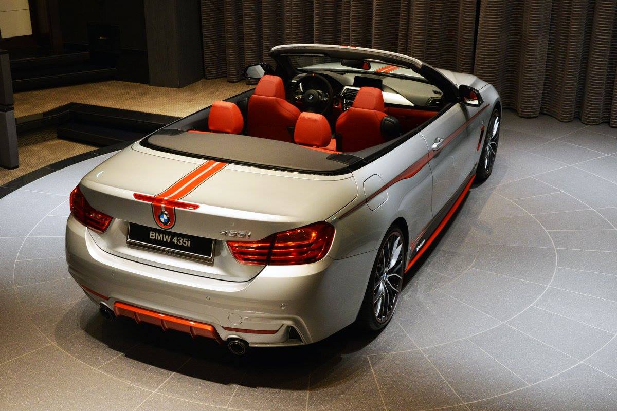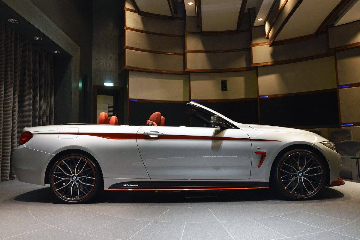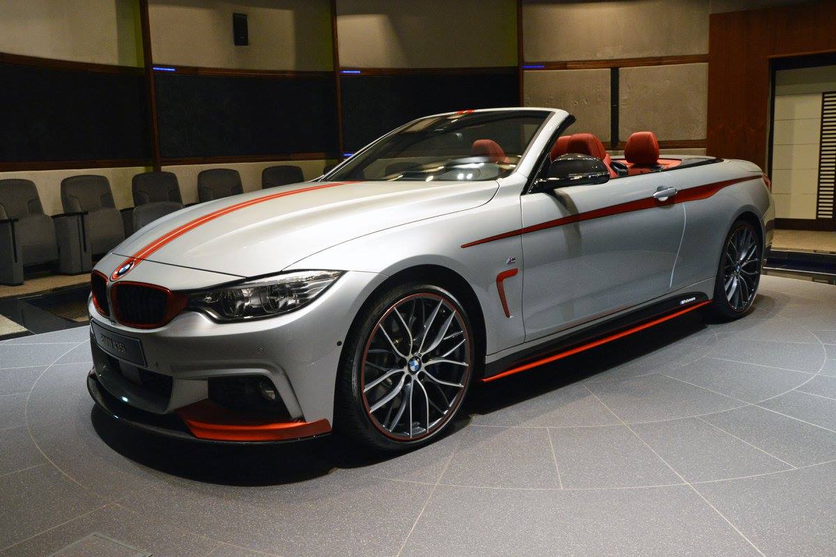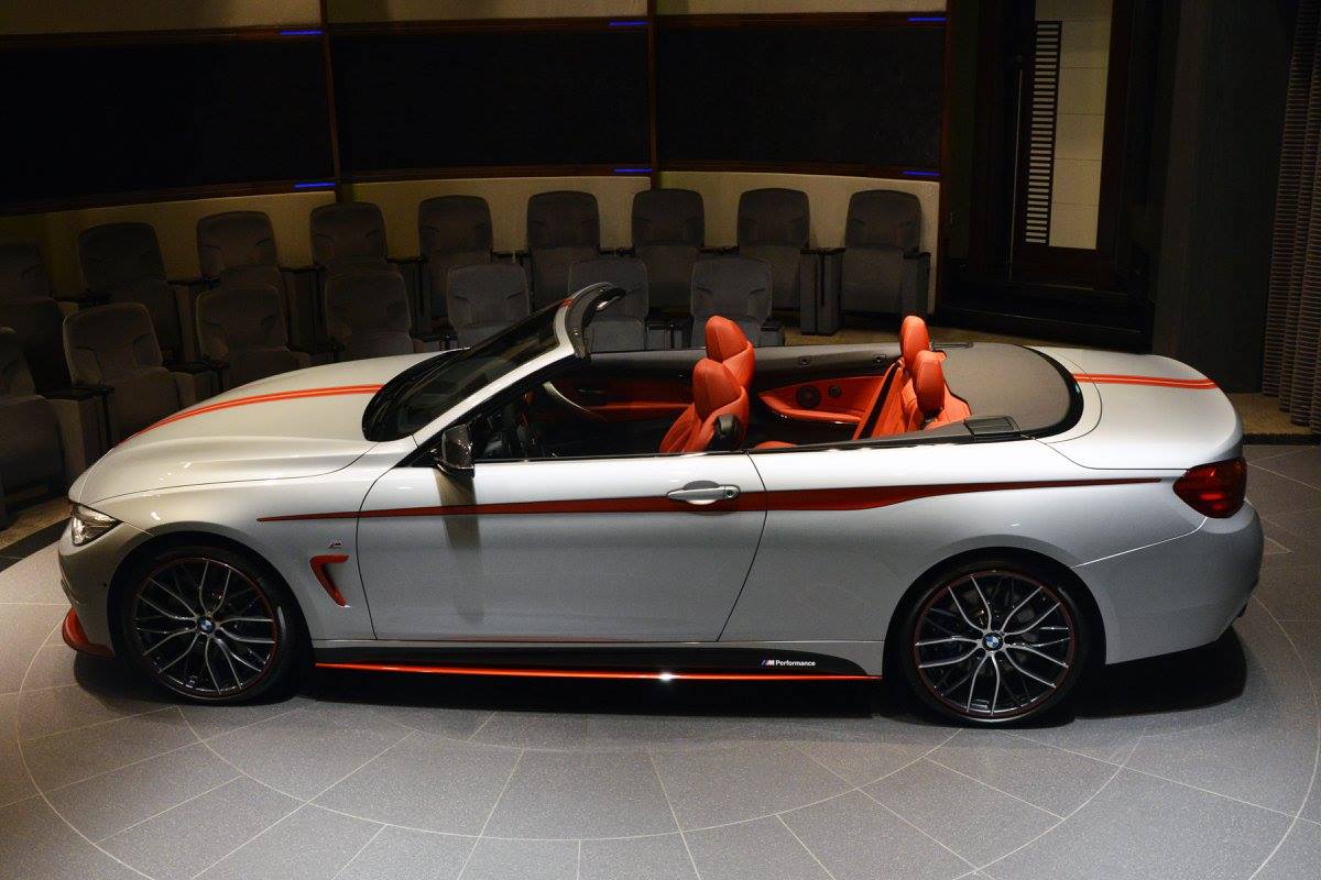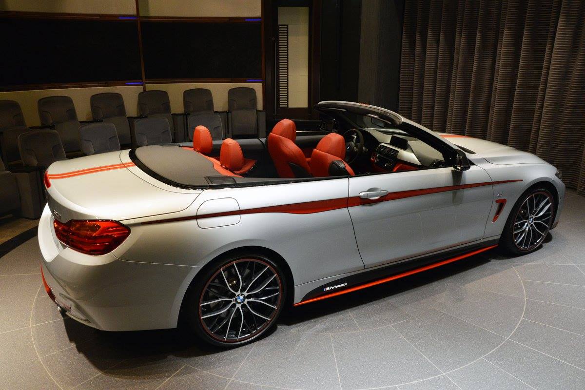 This convertible 435i, which which comes courtesy of the company’s Abu Dhabi dealership, has a lot of extra kit on it, from the M Performance bits, orange stripes, rear diffuser, front spoiler and kidney grille to the M-badged steering wheel and orange interior.