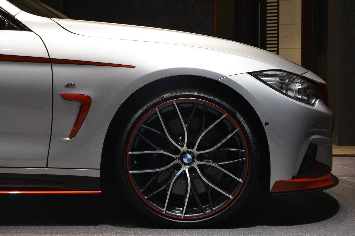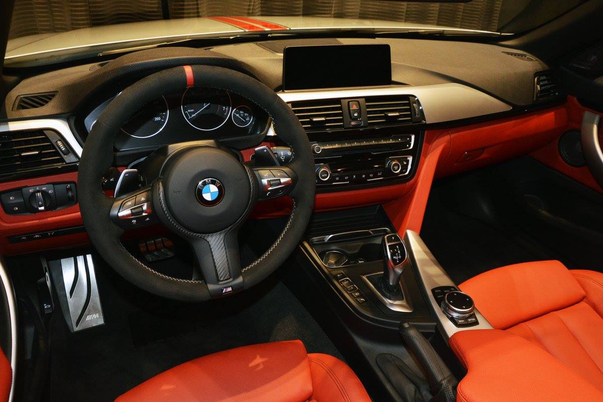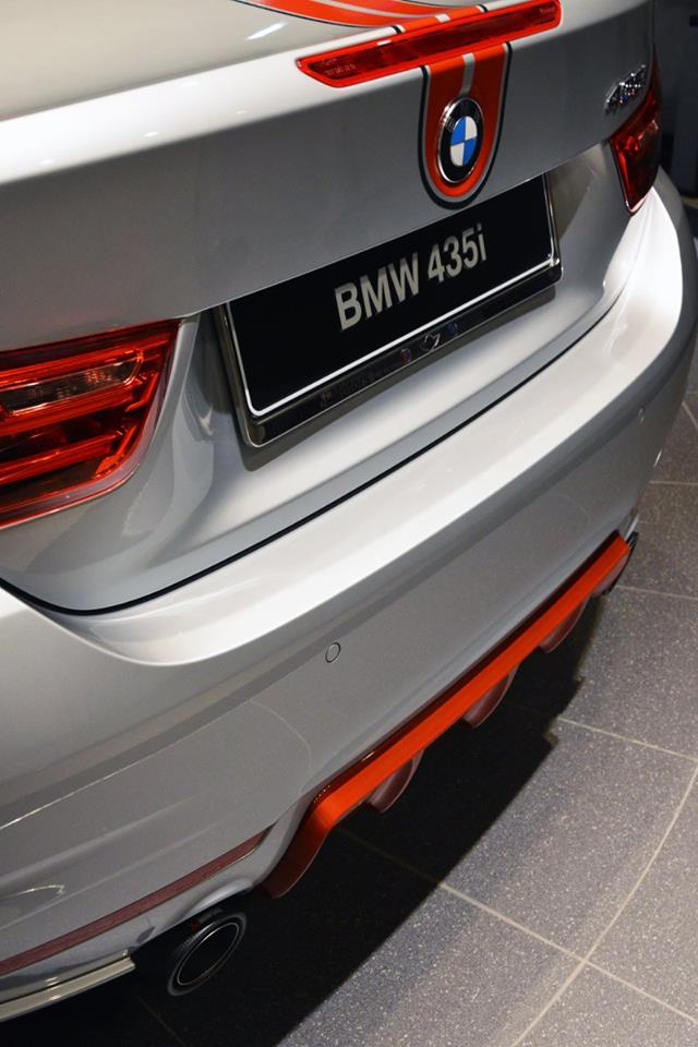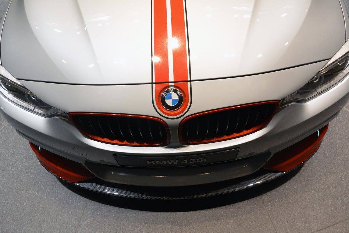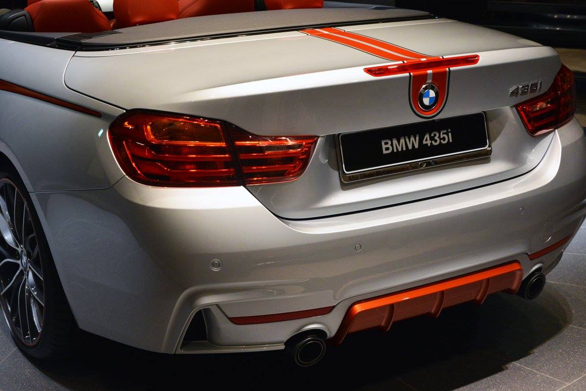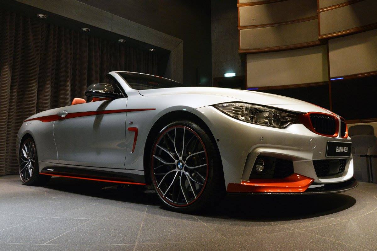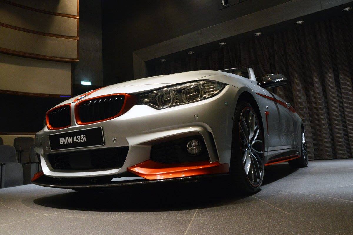 This convertible 435i, which which comes courtesy of the company’s Abu Dhabi dealership, has a lot of extra kit on it, from the M Performance bits, orange stripes, rear diffuser, front spoiler and kidney grille to the M-badged steering wheel and orange interior.