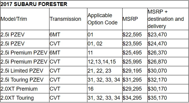 Subaru has finally announced pricing for updated 2017 Forester models in the US, where $22,595 will get you an entry-level 2.5i, 6-speed manual version.