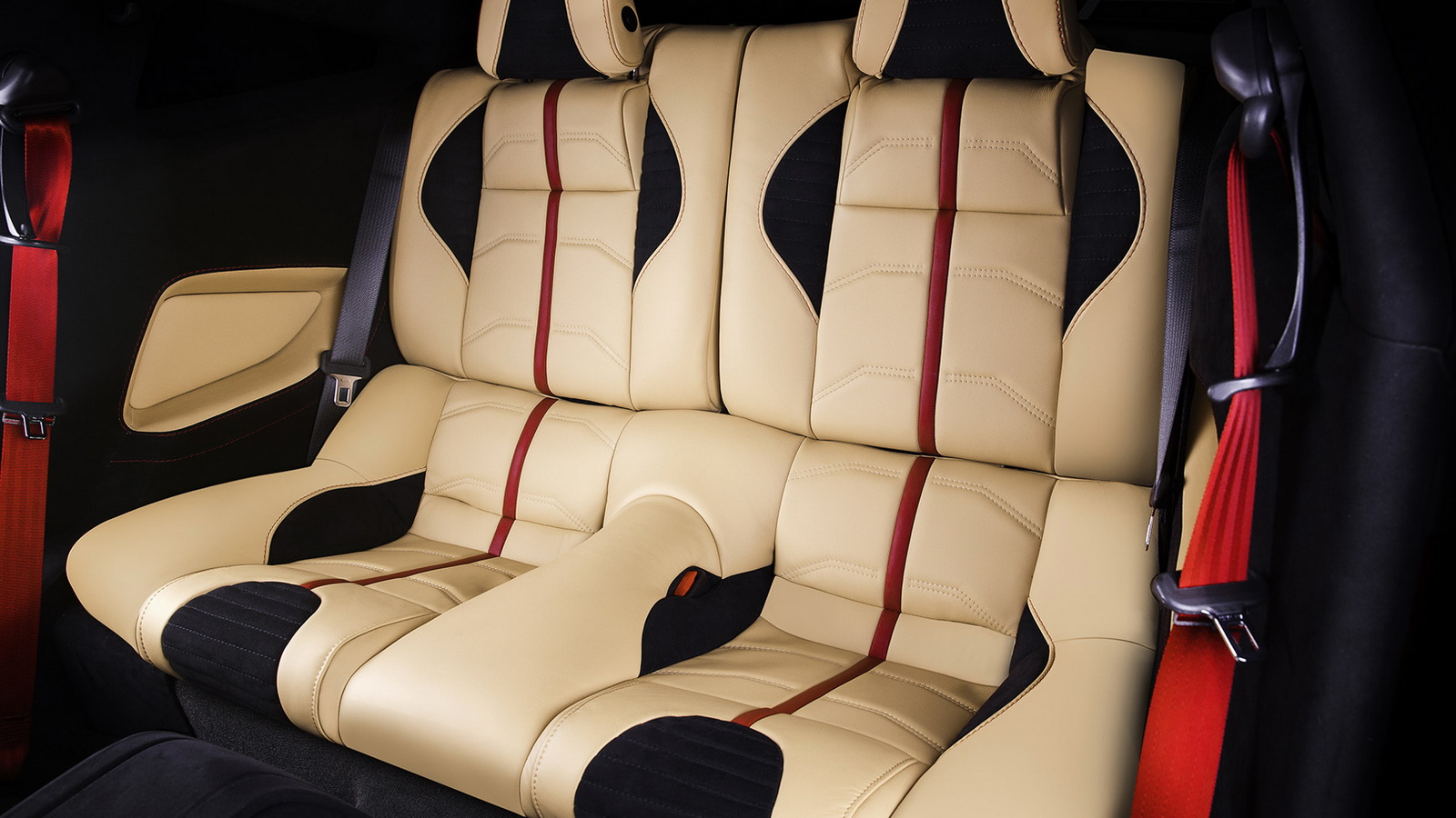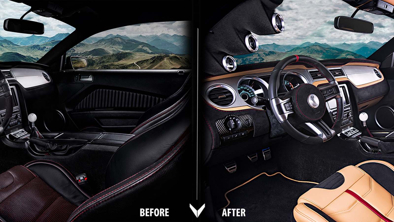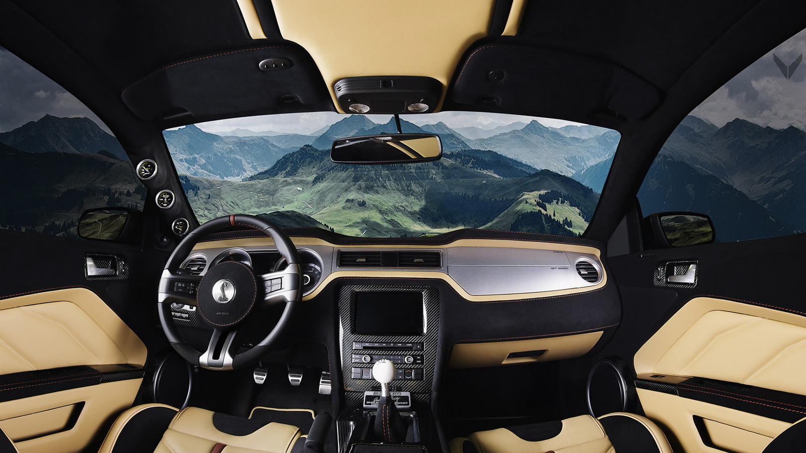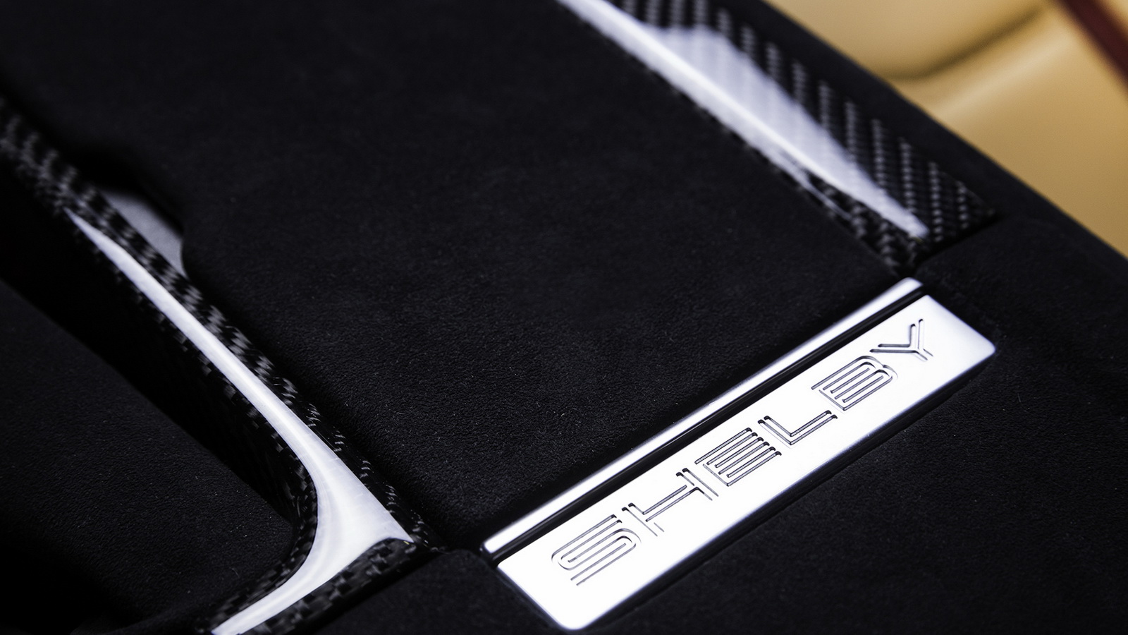 Commissioned by a Romanian customer, the muscle car’s cabin has been completely modified, except for the silver dashboard panel, door handles and gear lever ball. The original Shelby number plate has been left in place, but the rest of the interior carries beige leather and Alcantara-wrapped steering wheel, steering column, transmission tunnel and parts of the doors.