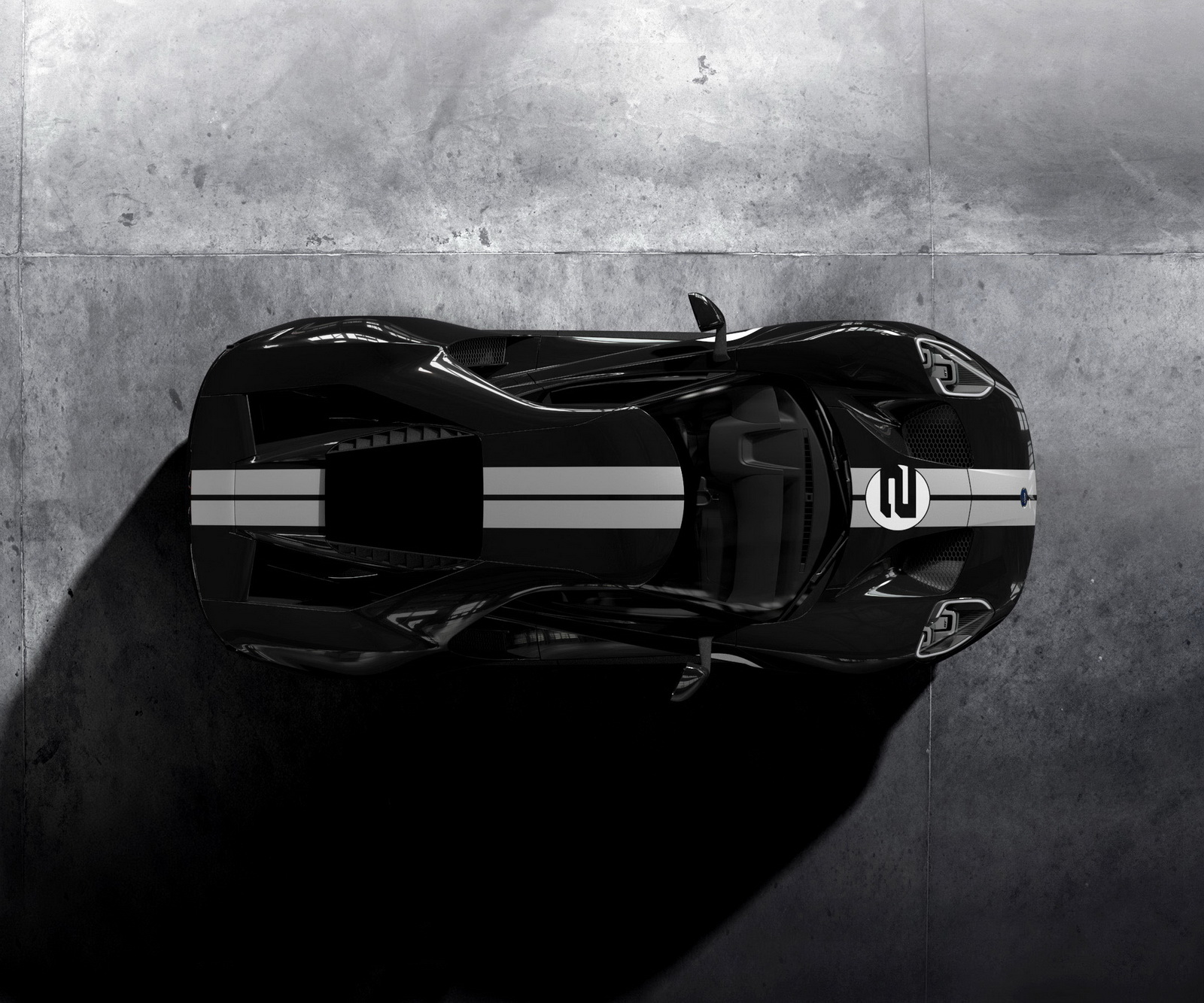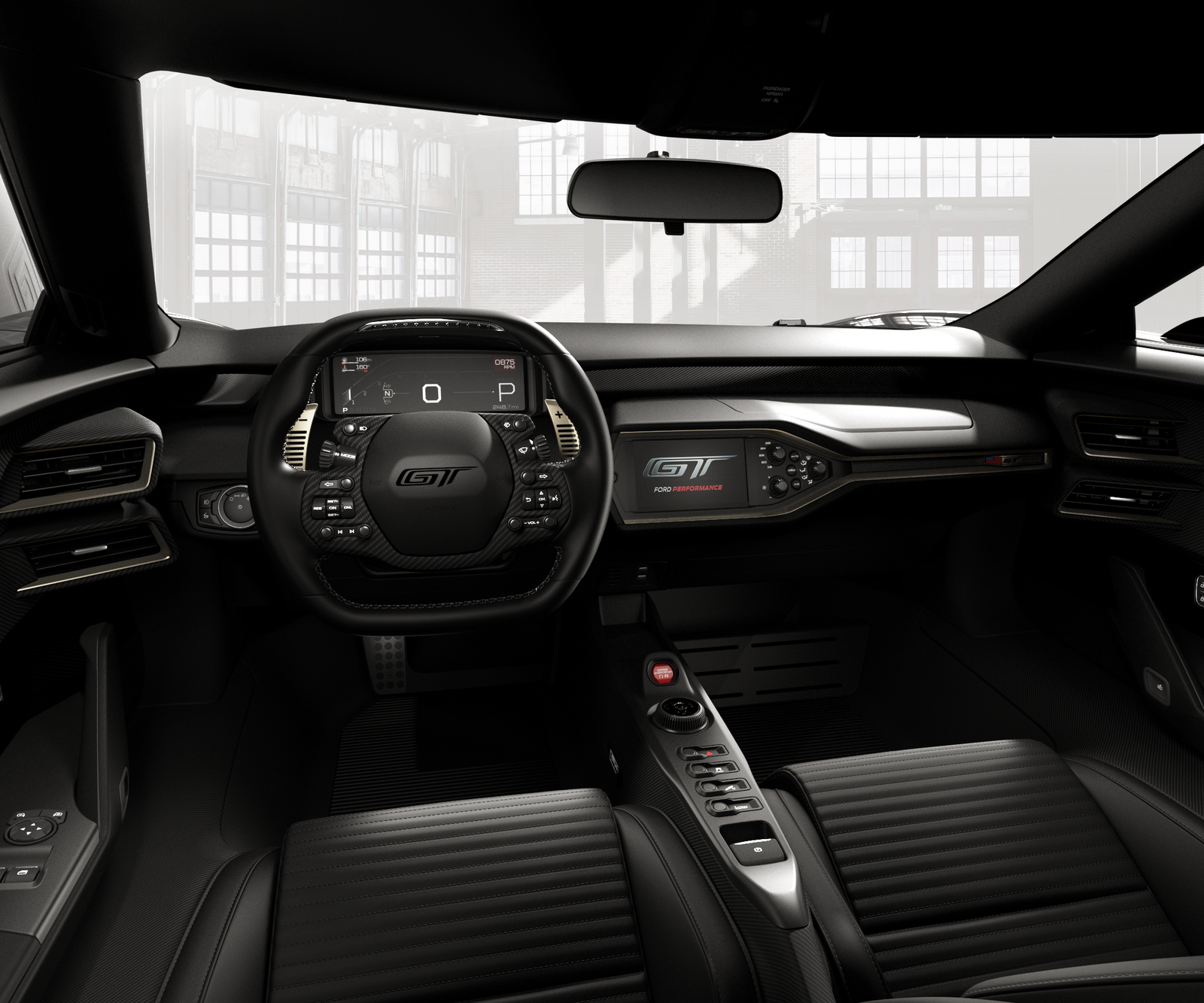 Inside, it gets a unique serialized identification plate, #2 door graphics, exposed matter carbon fiber bits and pieces, Ebony leather wrapped carbon fiber seats, instrument panel, pillars and headliner, Ford GT logo on the head restraints and steering wheel, gold appliqués on the instrument panel, unique blue webbing seatbelts and leather wrapped steering wheel.