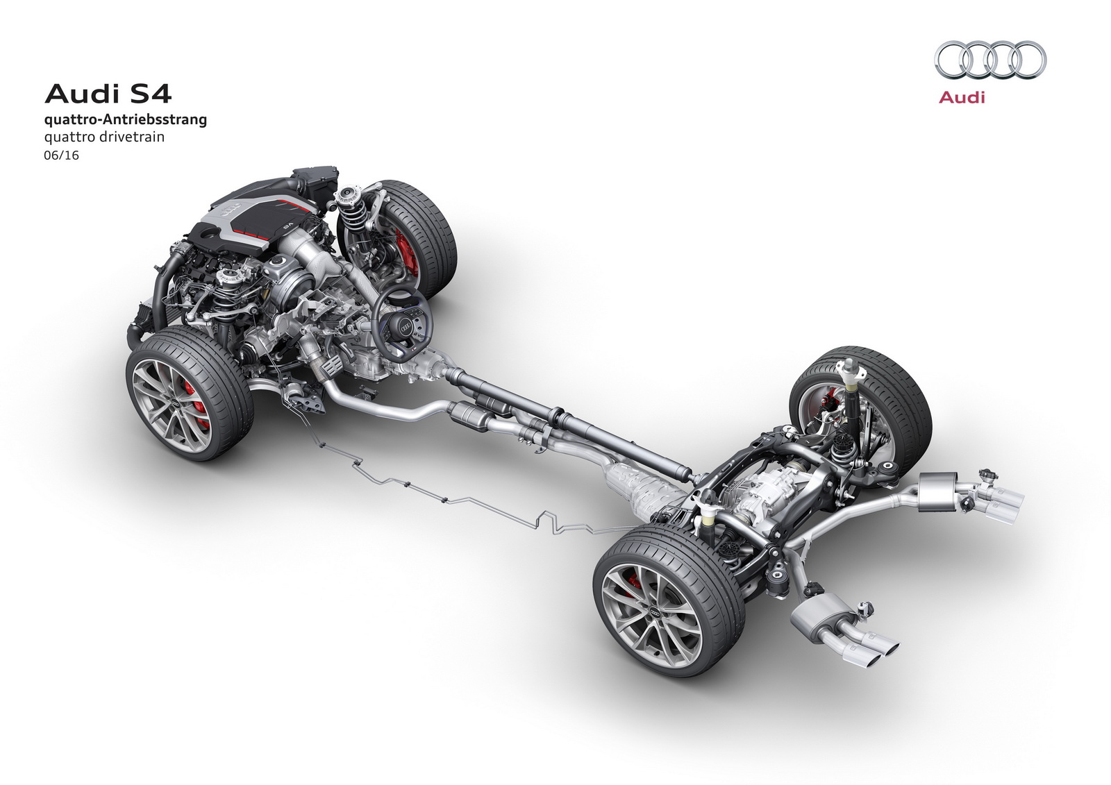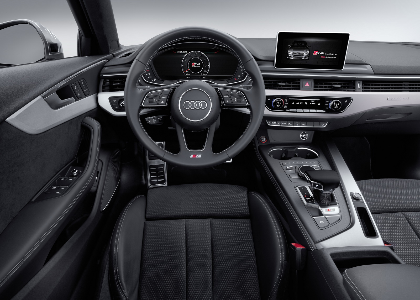 The ride height is lowered by 23mm compared to standard A4 models. The six-piston front brakes measure 350mm in diameter, while a set of 18in alloys is offered as standard. Audi says that the S4 sedan tips the scales at 1630kg, with the Avant version weighing 1,675kg (3,693 lbs), 75kg (165 lbs) less than the previous models.