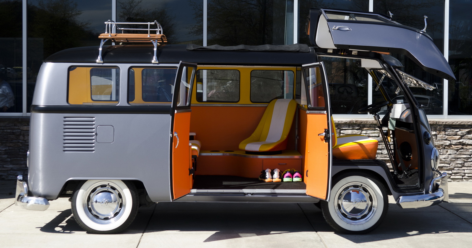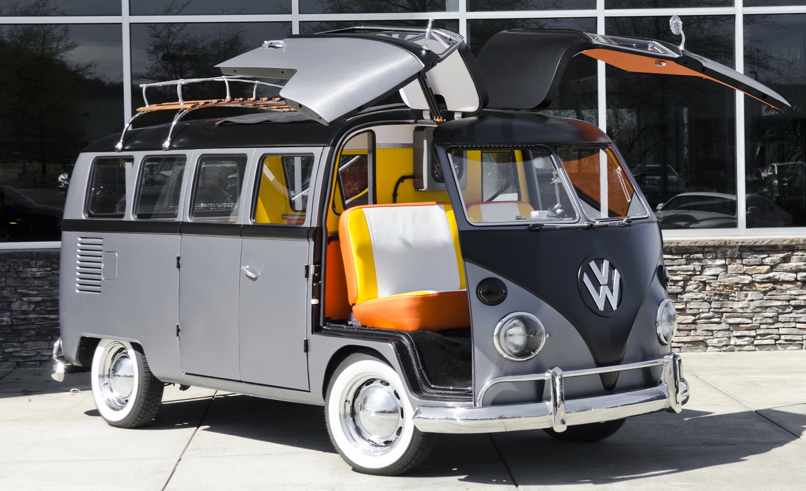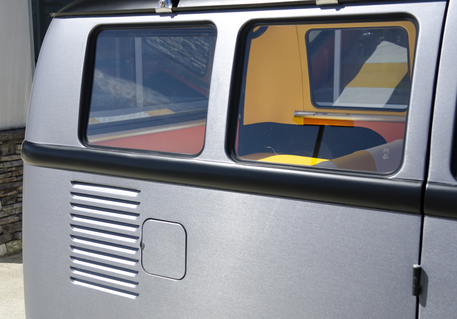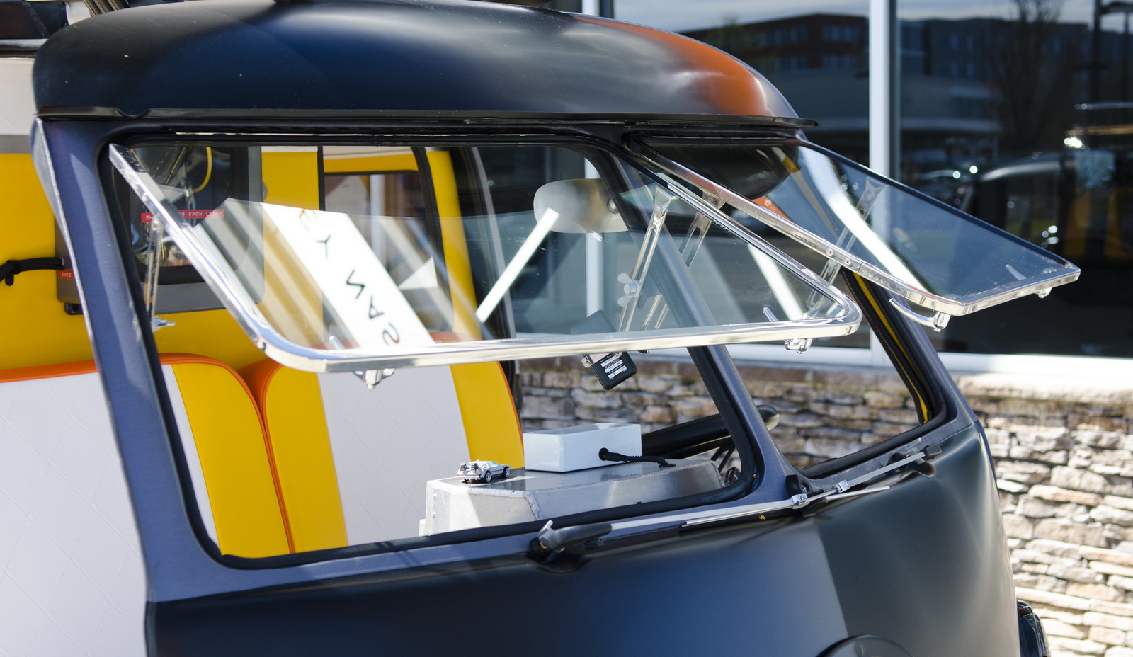 Upon completion, the car was presented with a stainless steel vinyl wrap, which mimics the DeLorean’s body, and gull-wing styled doors, although the Volkswagen still retains the stock sliding side door.