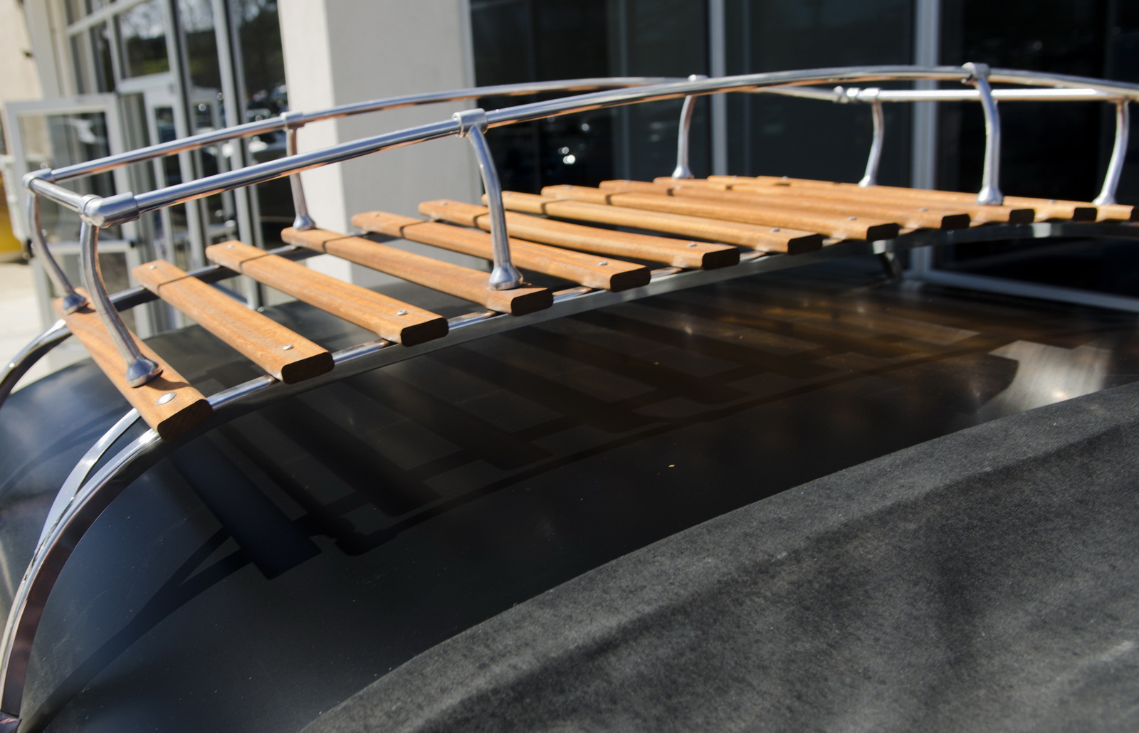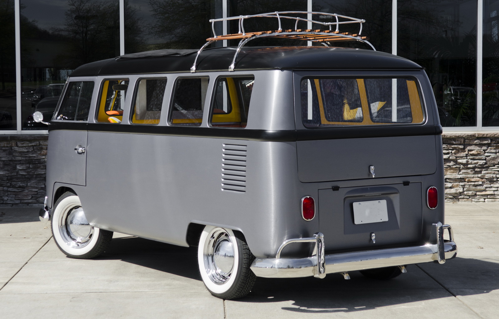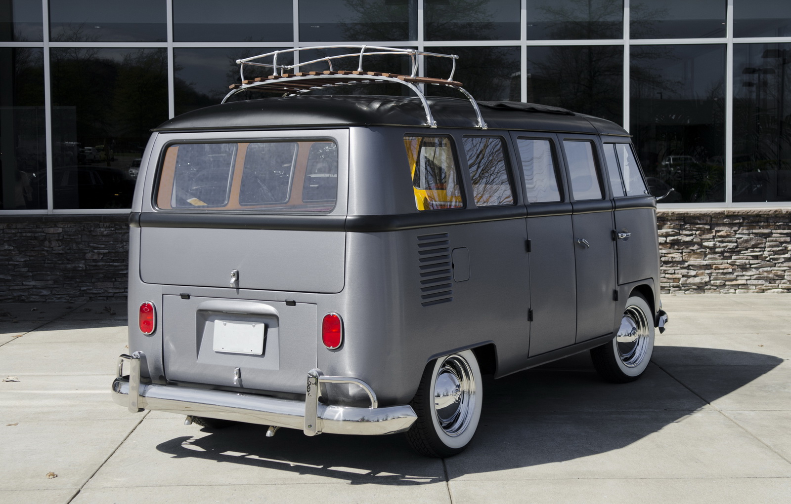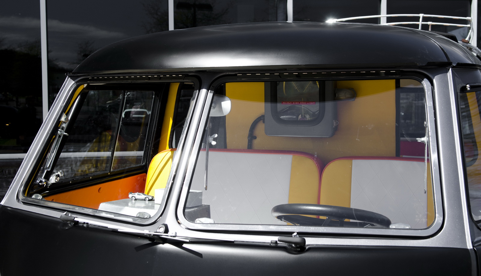 Upon completion, the car was presented with a stainless steel vinyl wrap, which mimics the DeLorean’s body, and gull-wing styled doors, although the Volkswagen still retains the stock sliding side door.