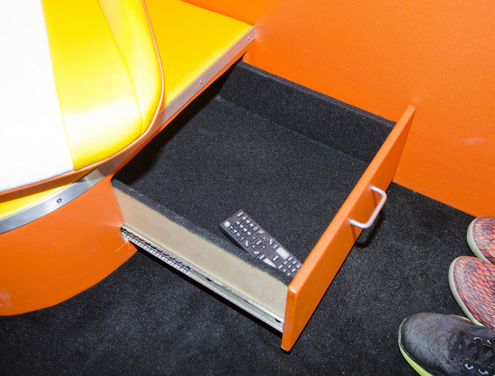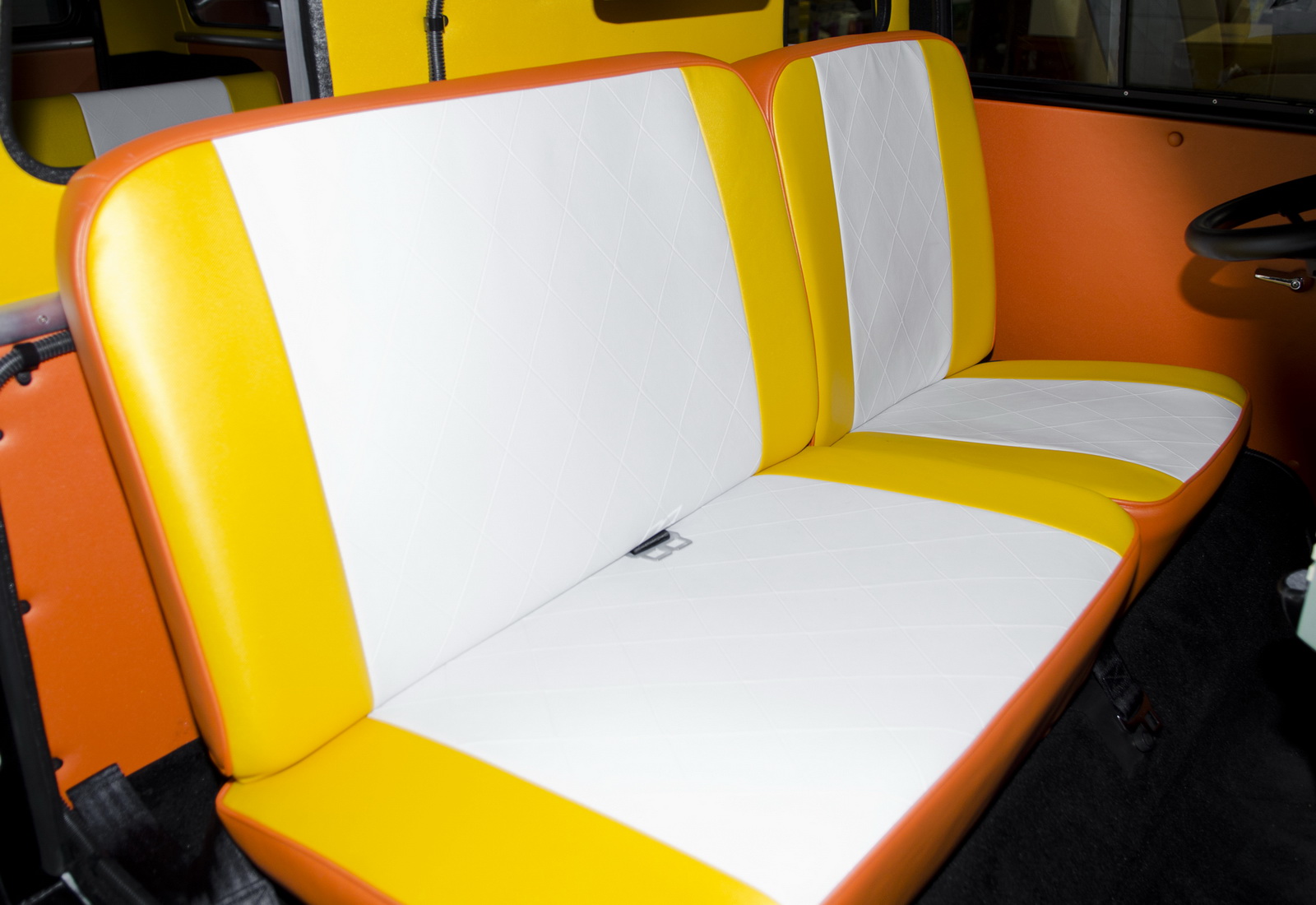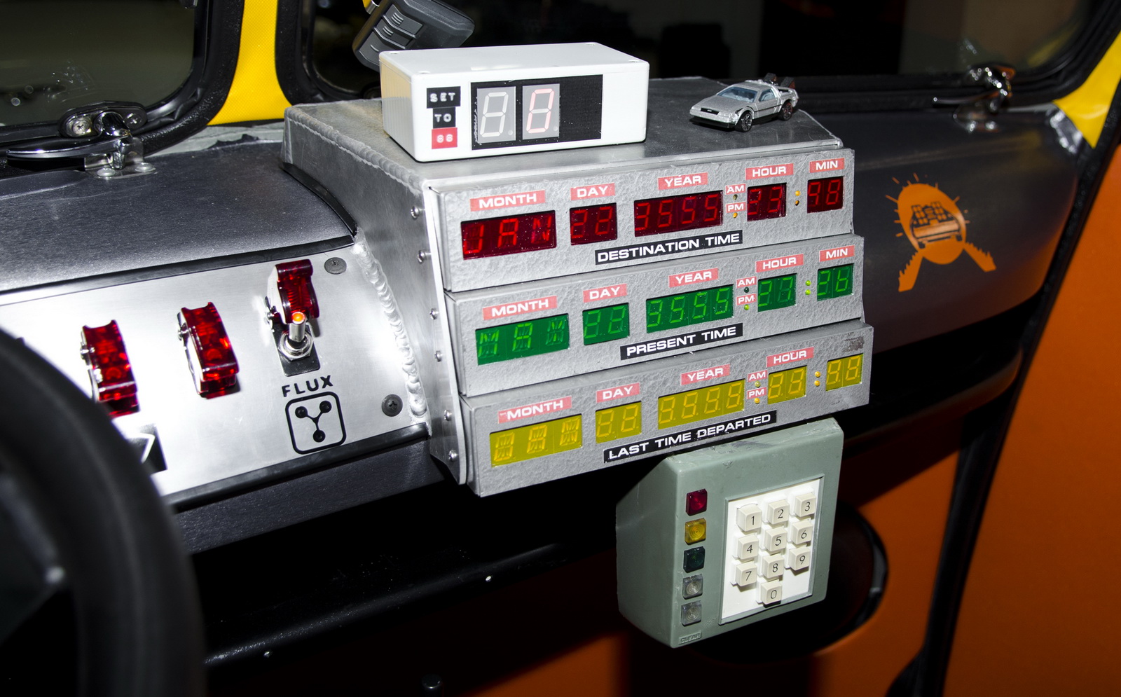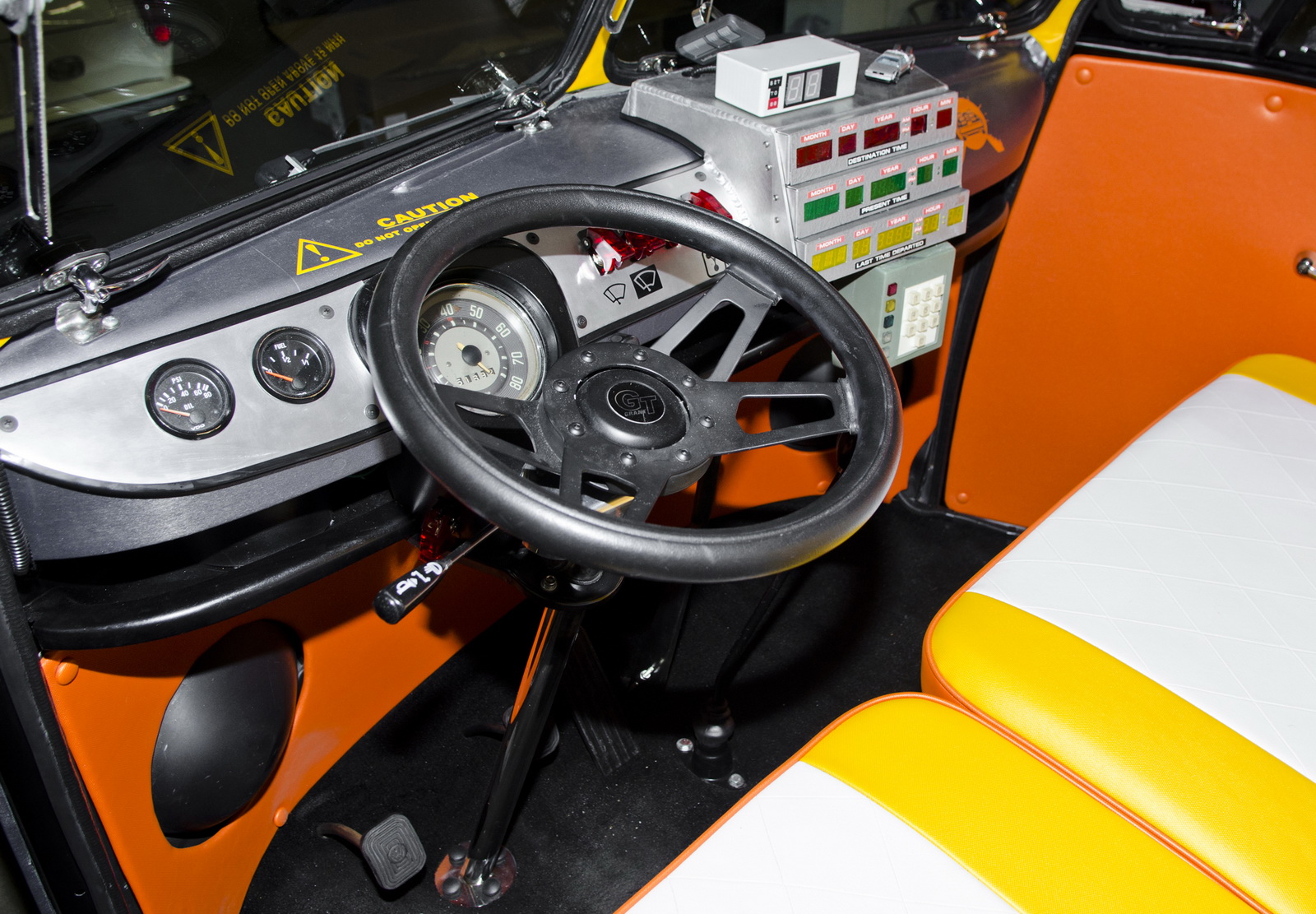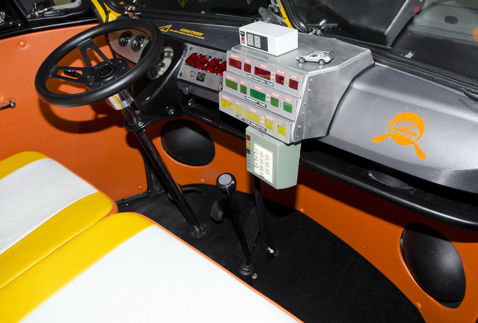 Inside, the car has been remodeled and refurbished, using a color scheme reminiscent of the Back to the Future logo. Moreover, the driver’s seat was transformed into a cockpit, equipped with a time machine module and flux capacitor.
