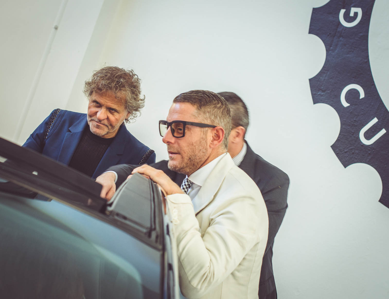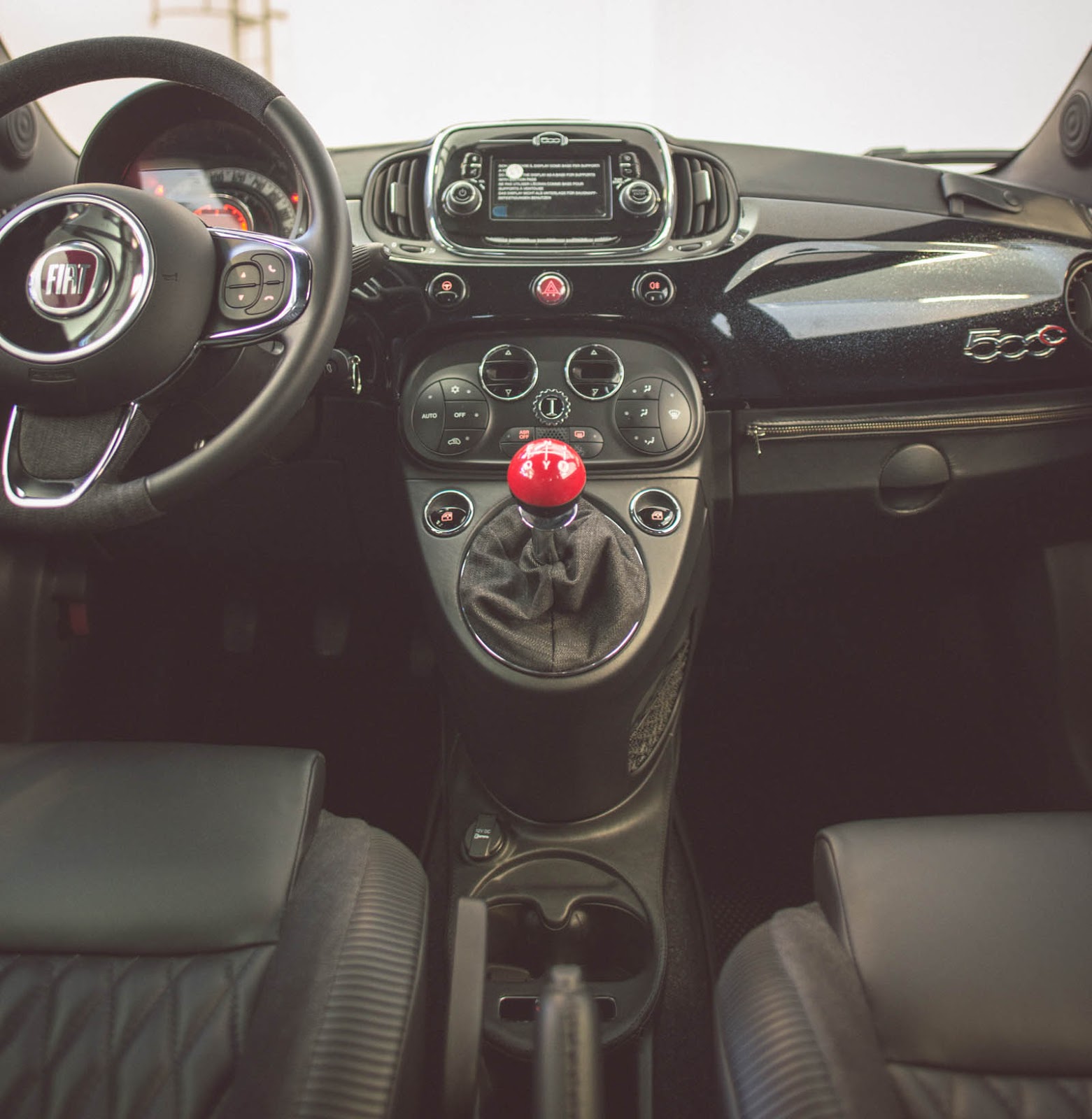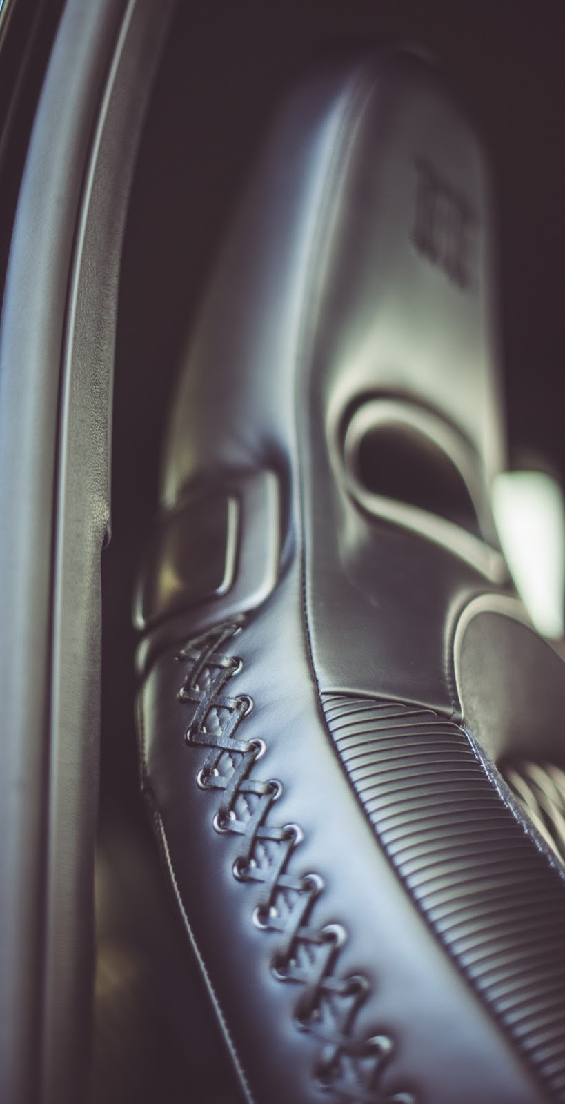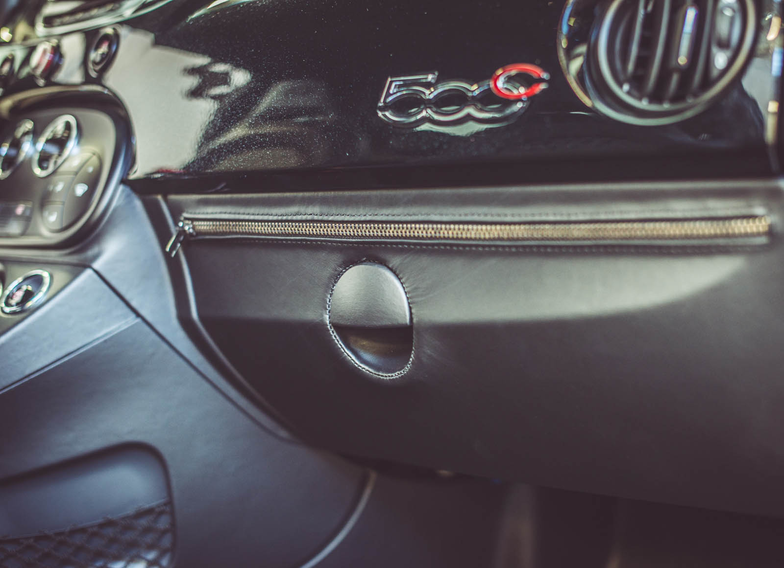 Inside, the seats and roof are upholstered in black leather with black denim details, pleated and laced leather trim, a zippered leather glove compartment, with the gear lever emblazoned with the word “Enjoy” that’s Rosso’s signature sign-off.