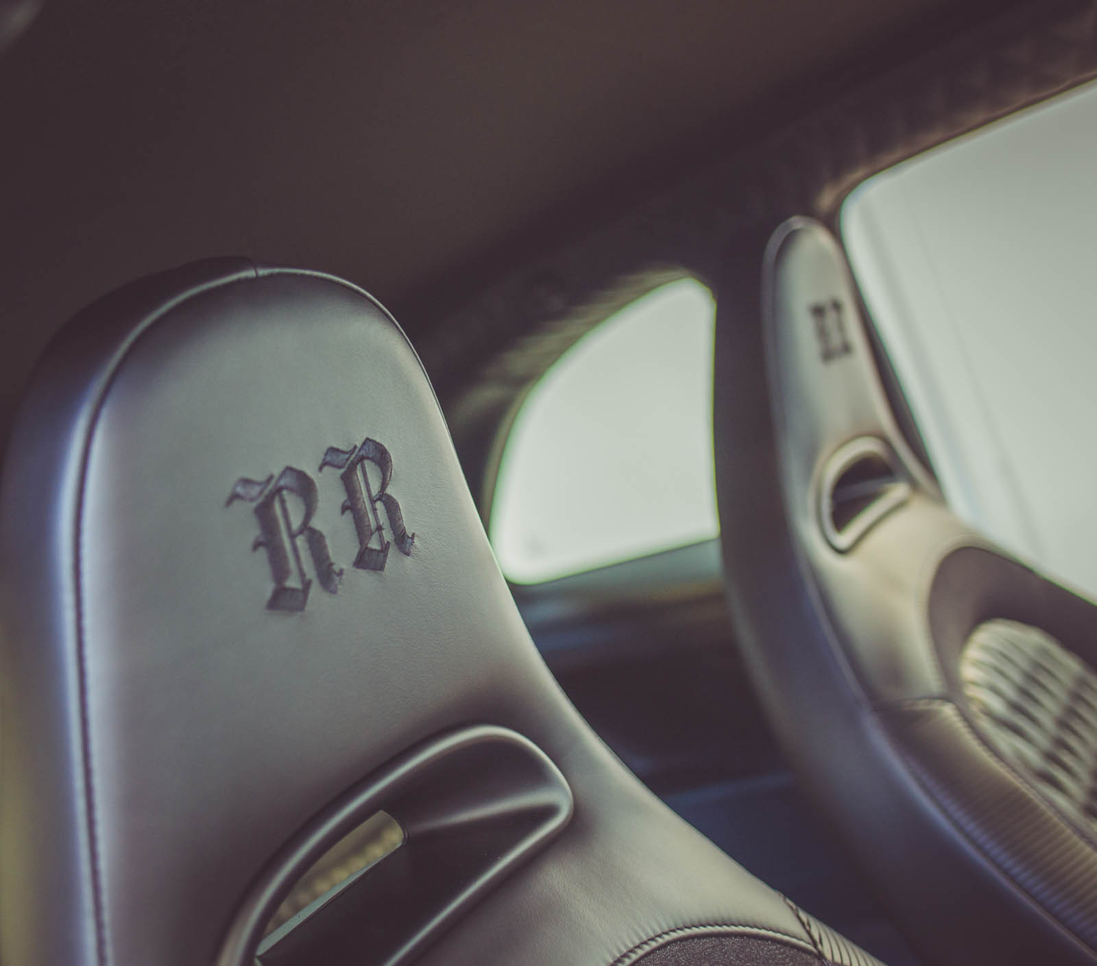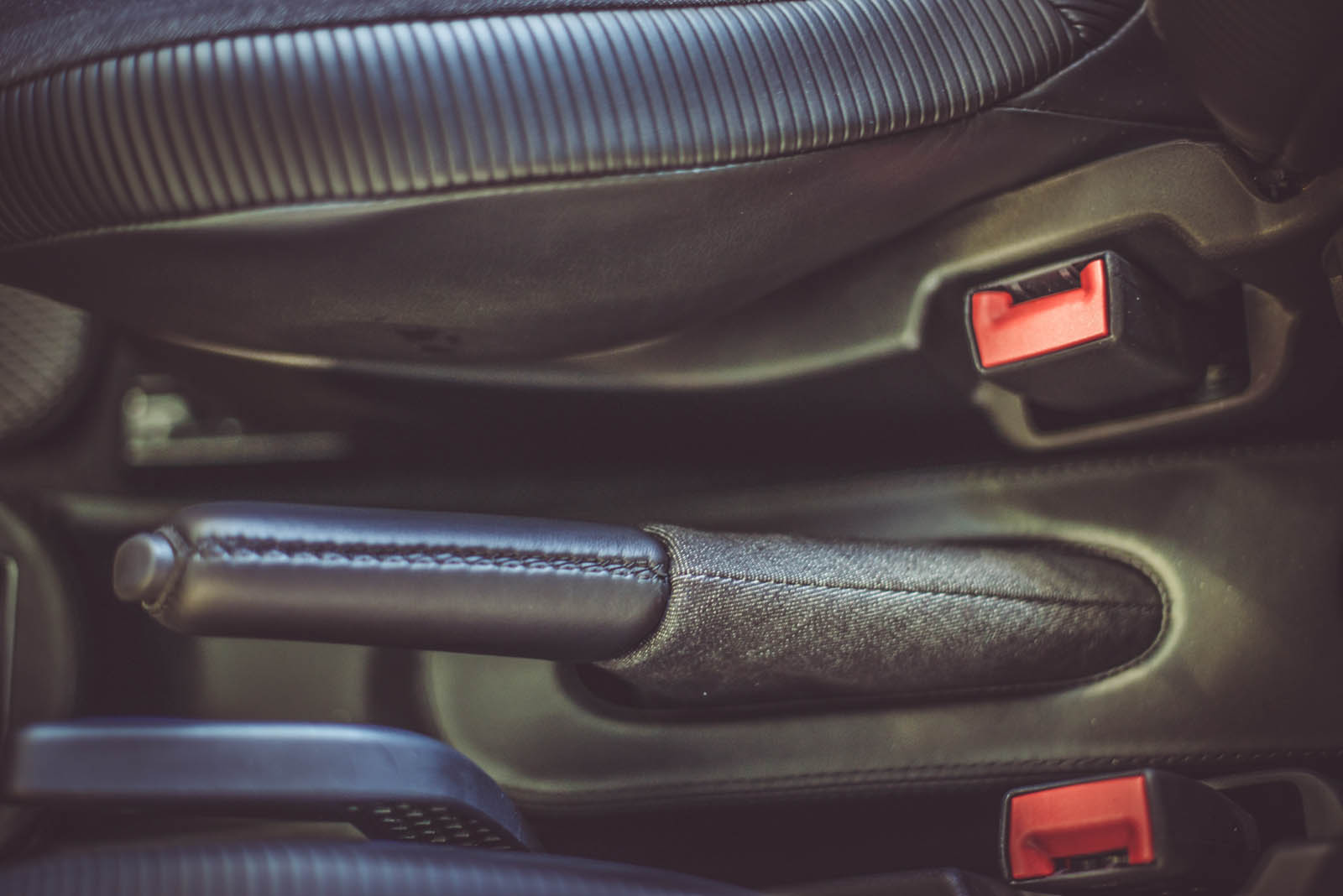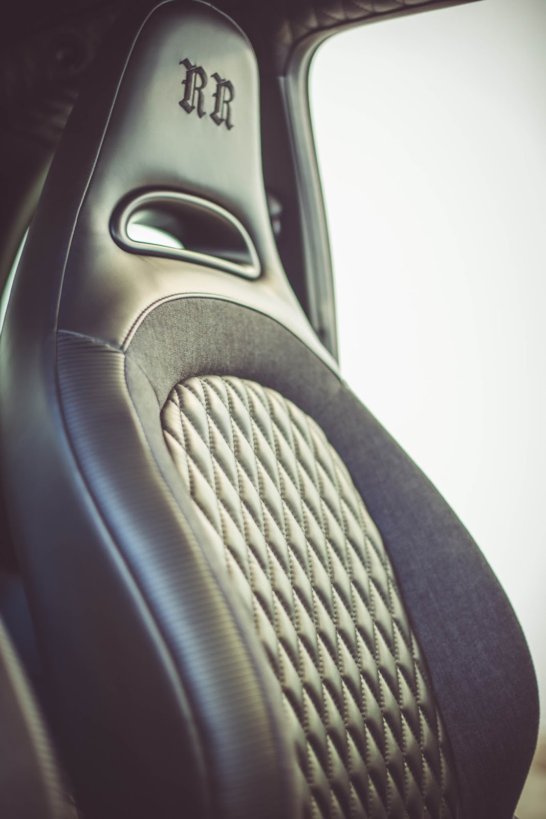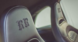 Inside, the seats and roof are upholstered in black leather with black denim details, pleated and laced leather trim, a zippered leather glove compartment, with the gear lever emblazoned with the word “Enjoy” that’s Rosso’s signature sign-off.