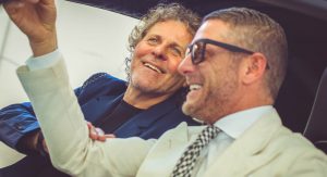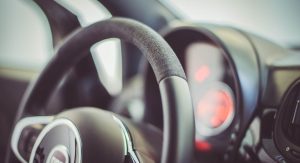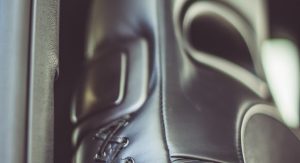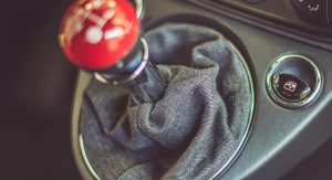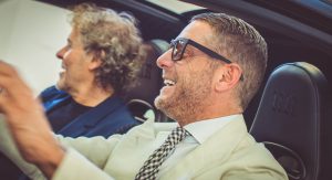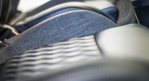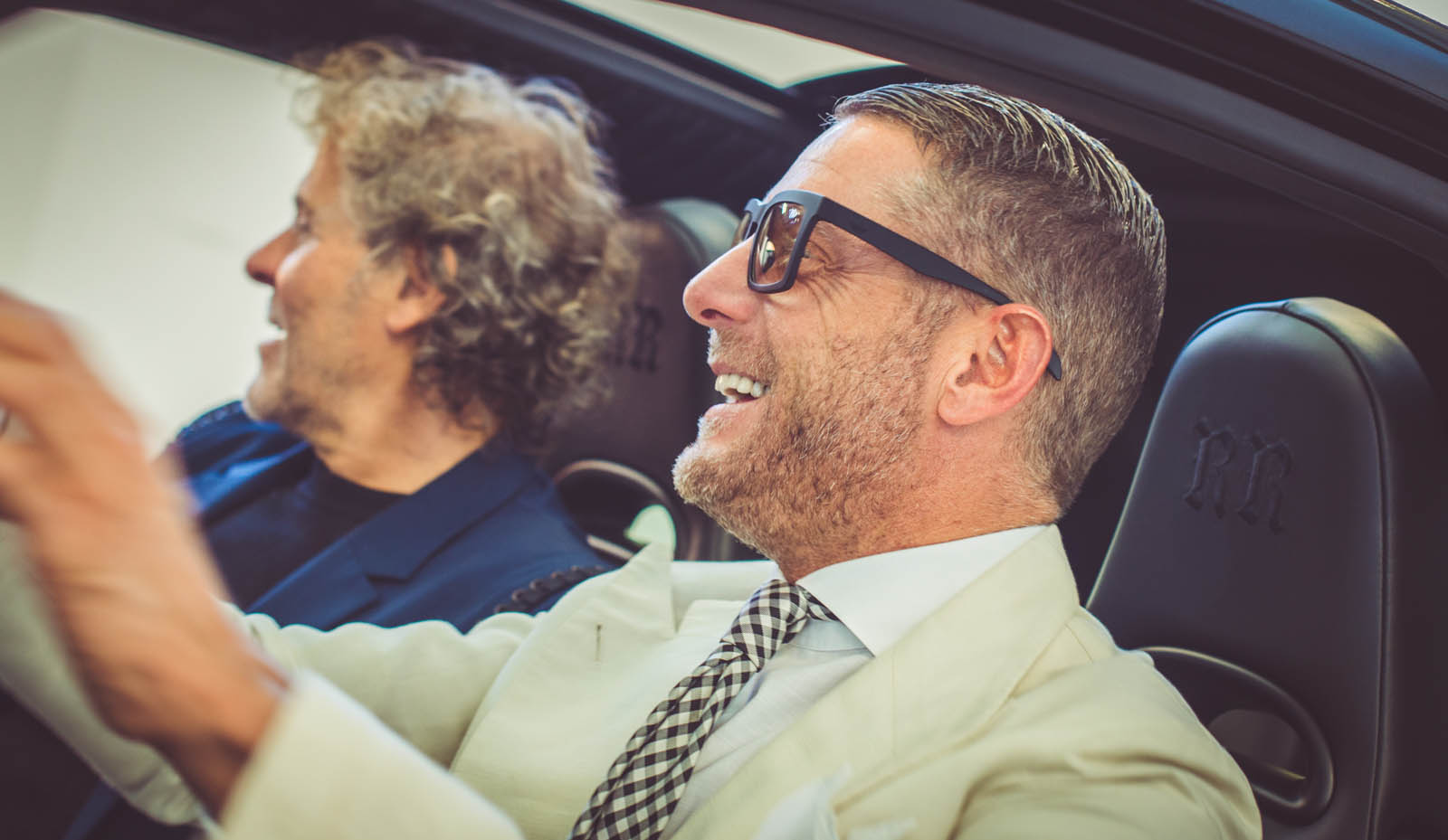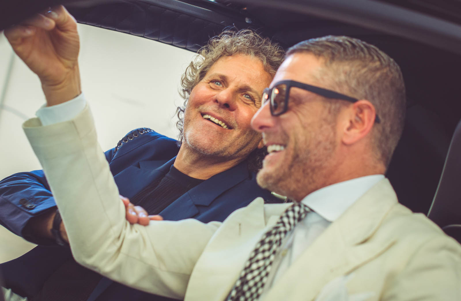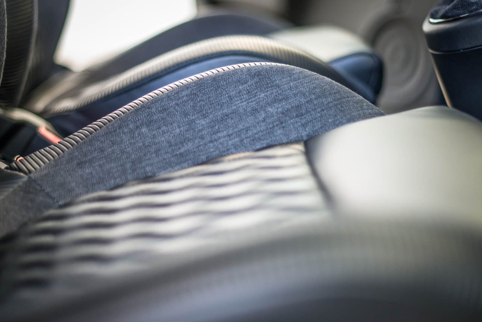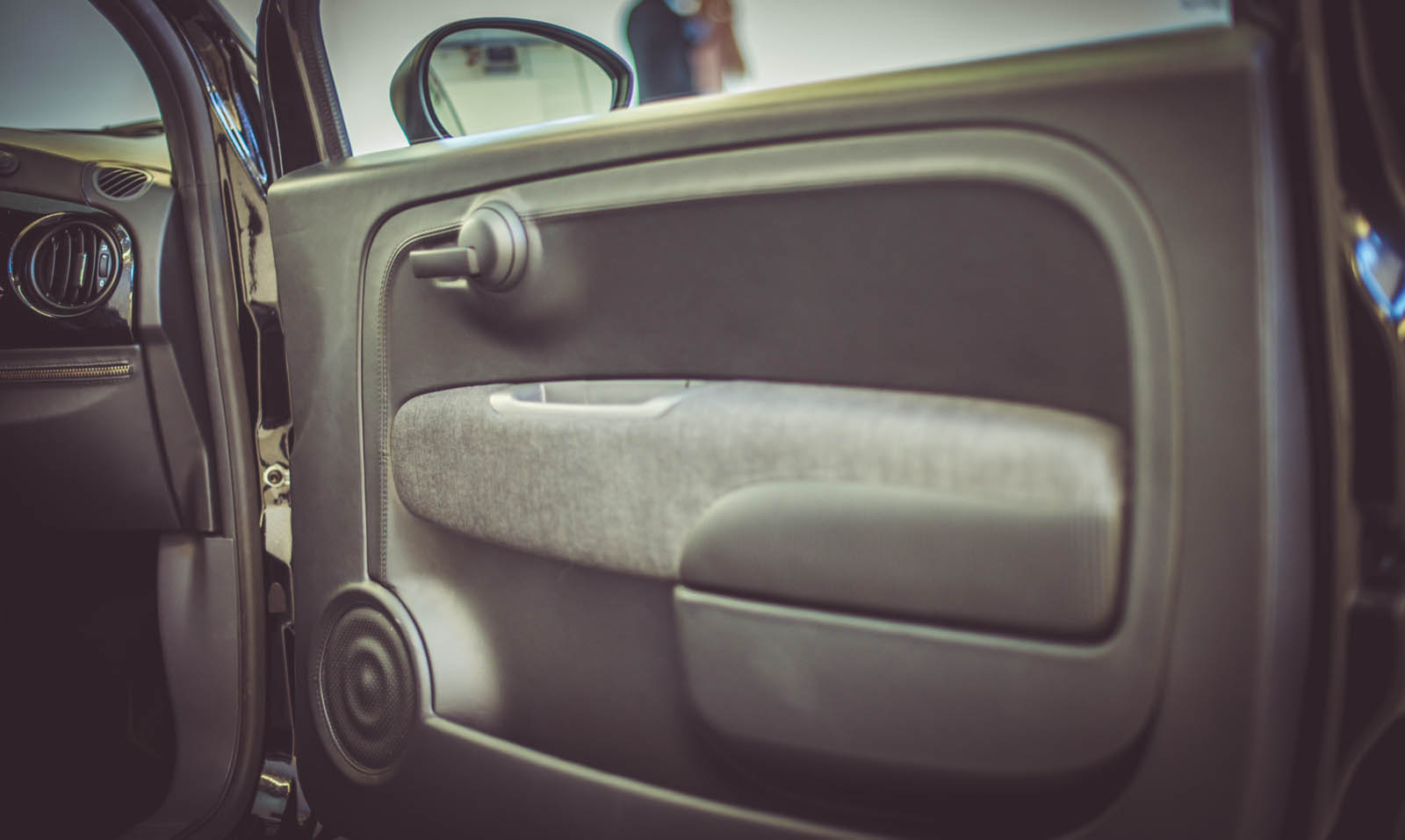 Inside, the seats and roof are upholstered in black leather with black denim details, pleated and laced leather trim, a zippered leather glove compartment, with the gear lever emblazoned with the word “Enjoy” that’s Rosso’s signature sign-off.