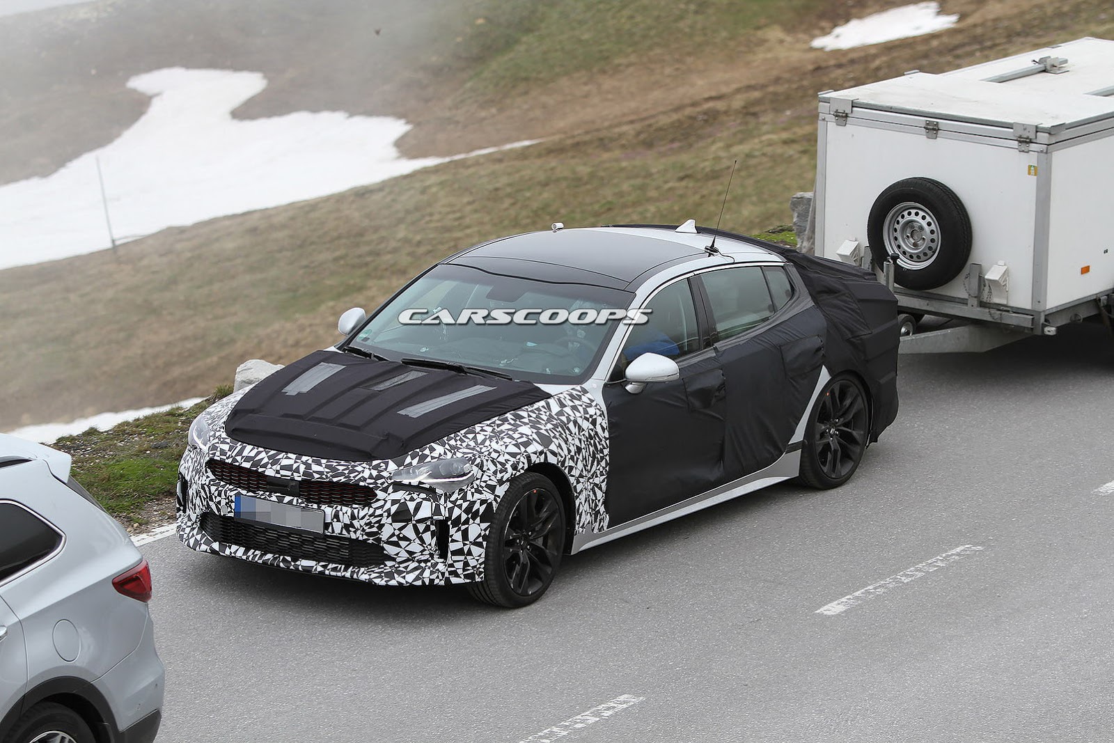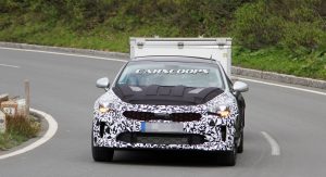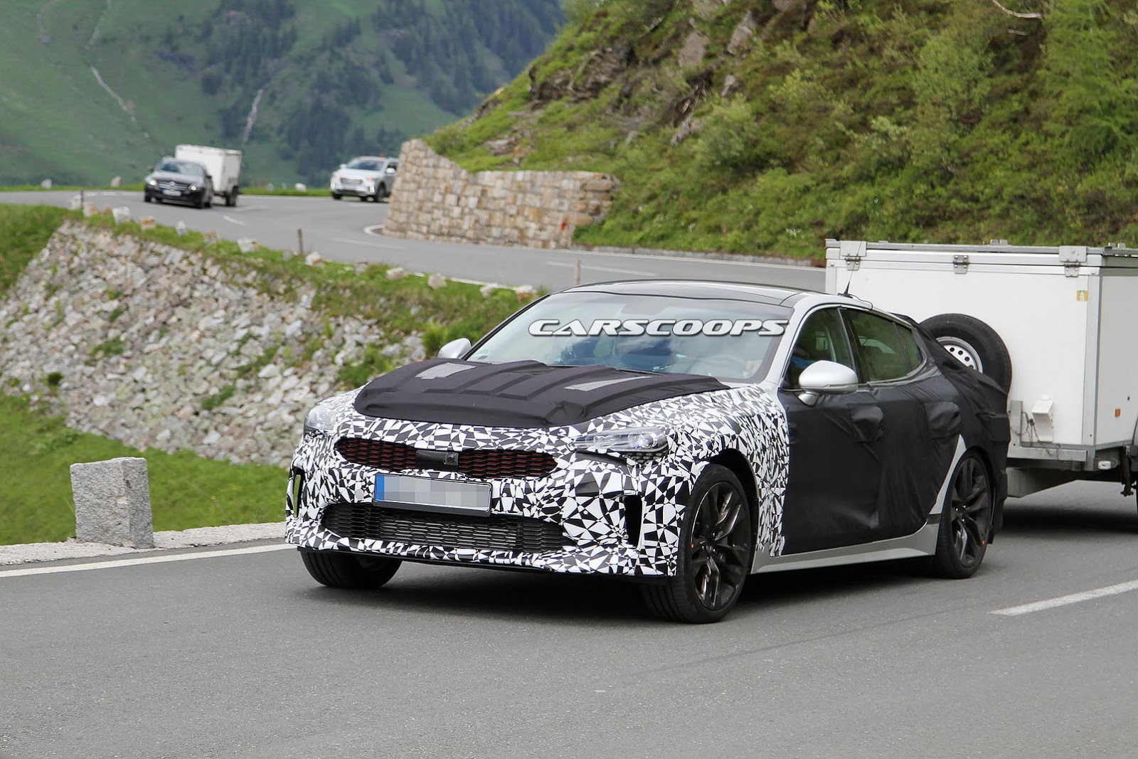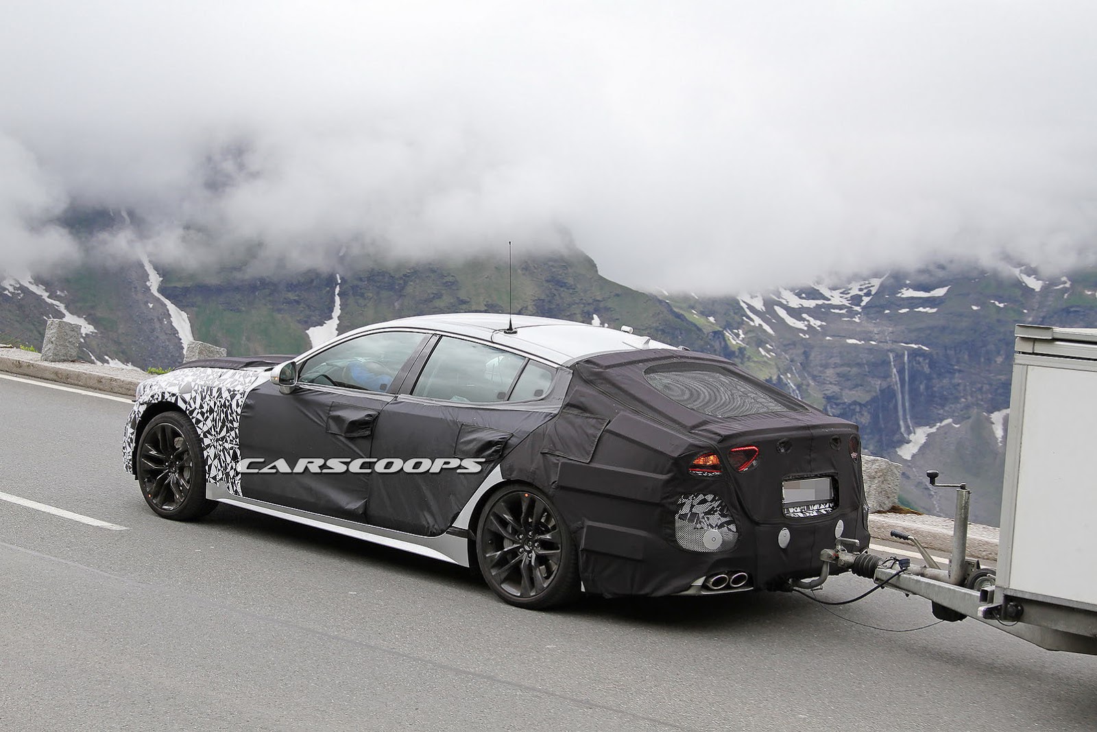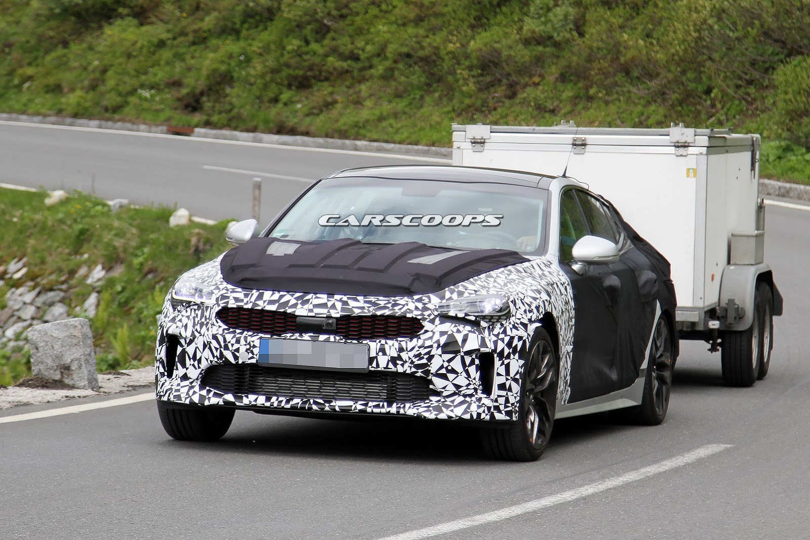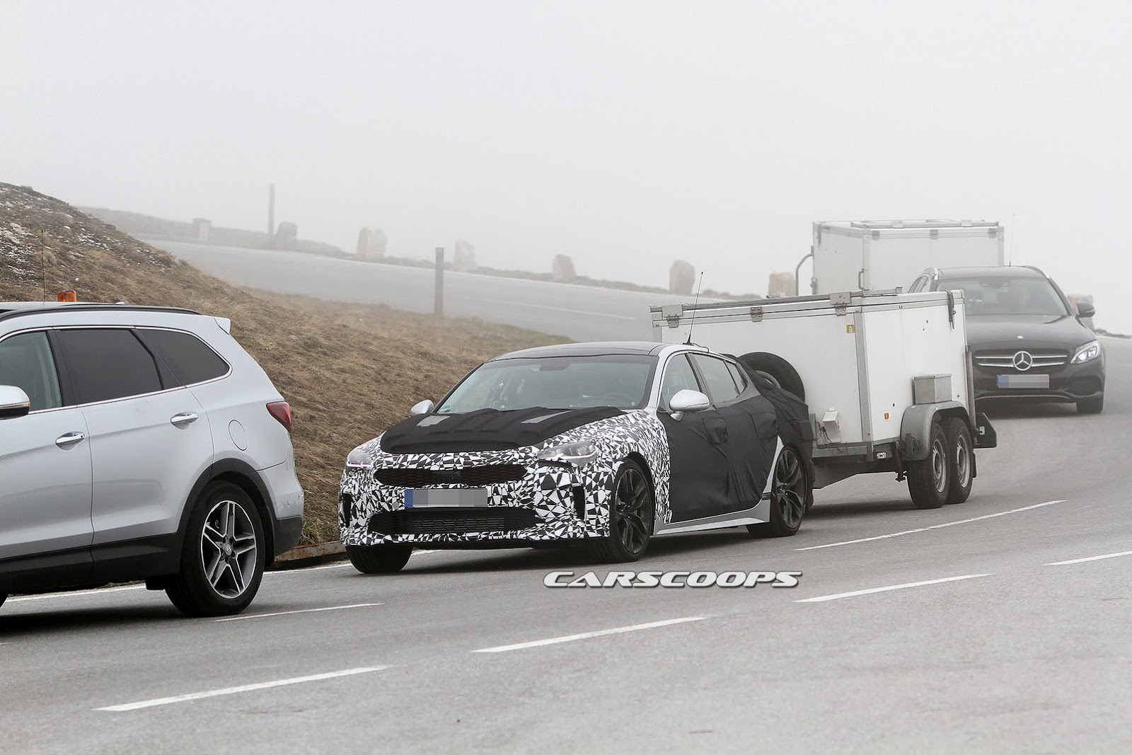 The photos show us the prototype towing a big trailer which is common practice during development for accelerated stress-testing of the powertrain components. Kia plans their new four-door coupe to be available on a global scale with a range of petrol and diesel engines, including the recently revealed 3.3-litre twin turbo V6 engine, which in the case of the Genesis G80 Sport, makes 365hp.