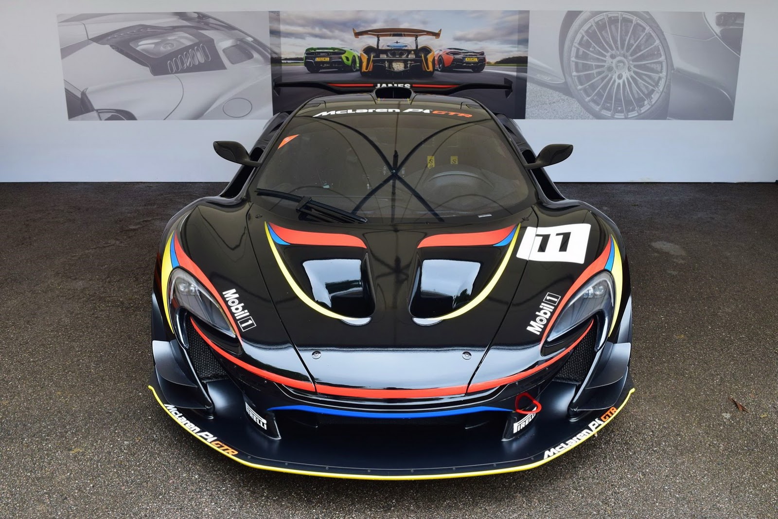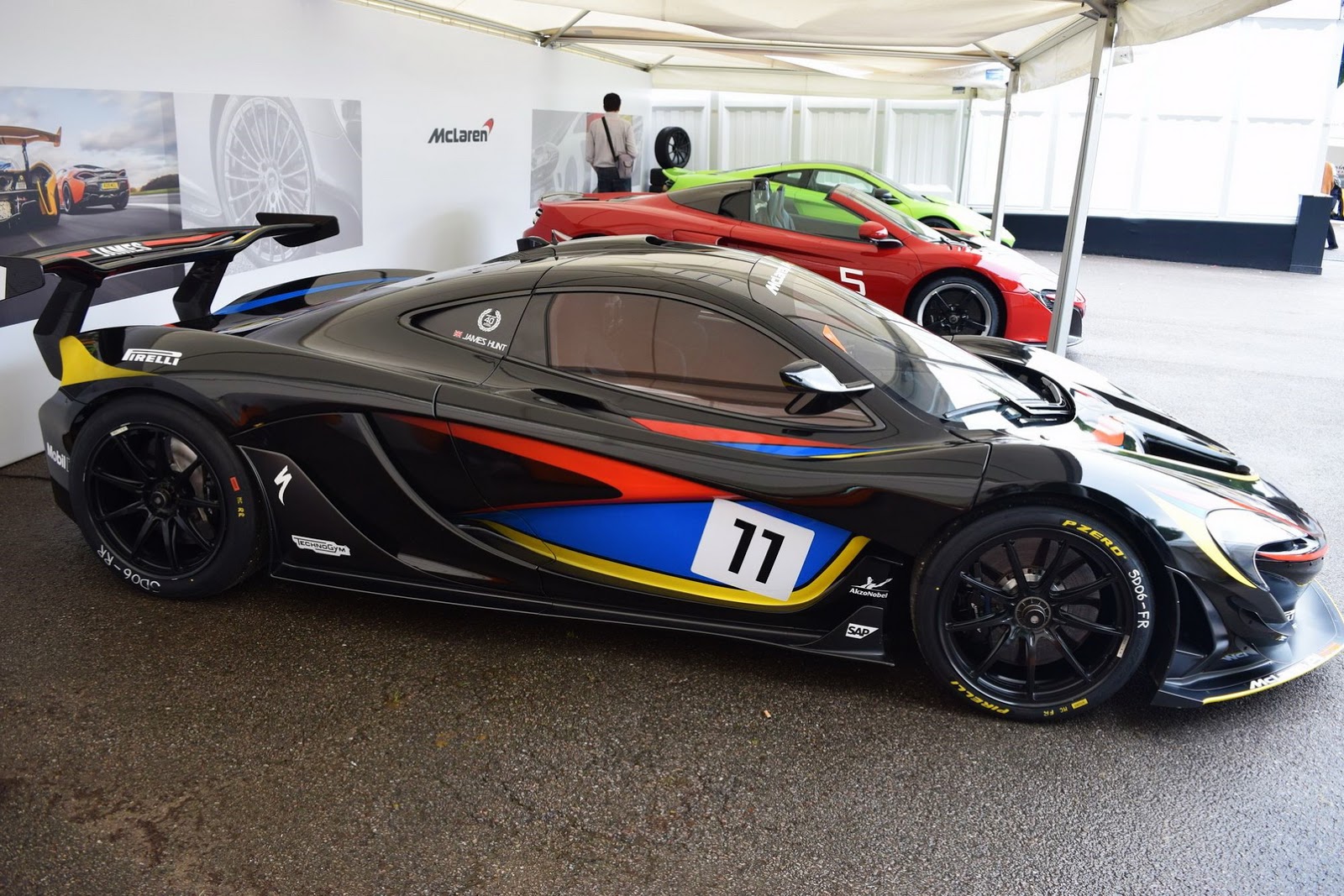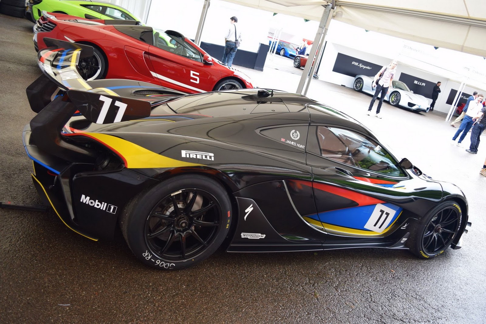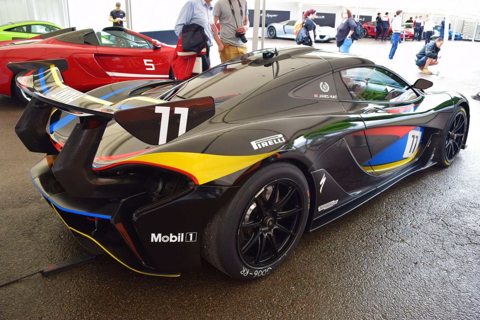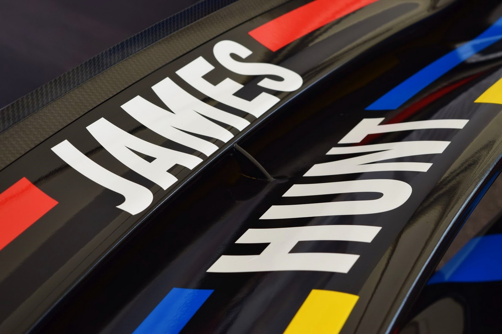 With a matte black paint and red, yellow and blue accents scattered across its body, this P1 GTR’s color scheme was inspired by that of James Hunt’s F1 helmet.
