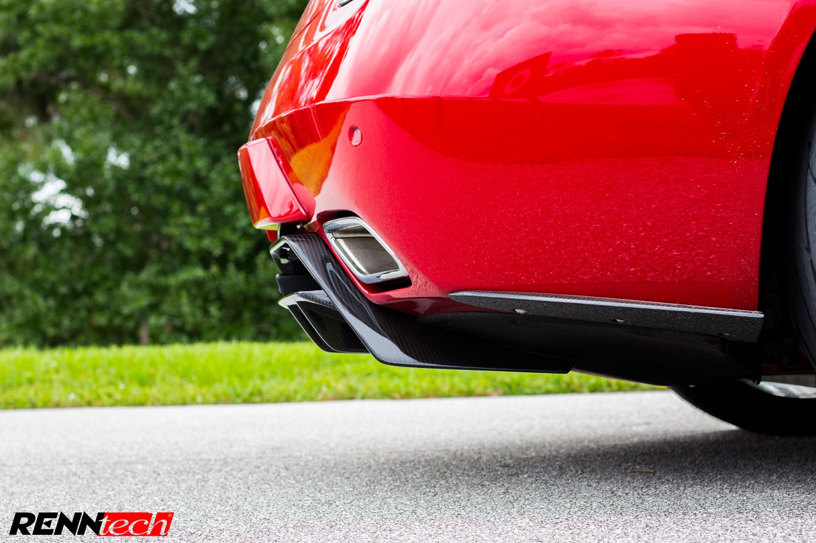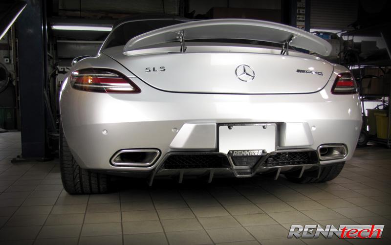 A carbon fiber diffuser, priced at $4,495, is supposed to decrease drag and increase downforce by improving underbody airflow. Renntech states that the new part is easy to install, but advises owners that, once in place, it will partially obscure the standard reverse camera and offers an optional camera housing extension.