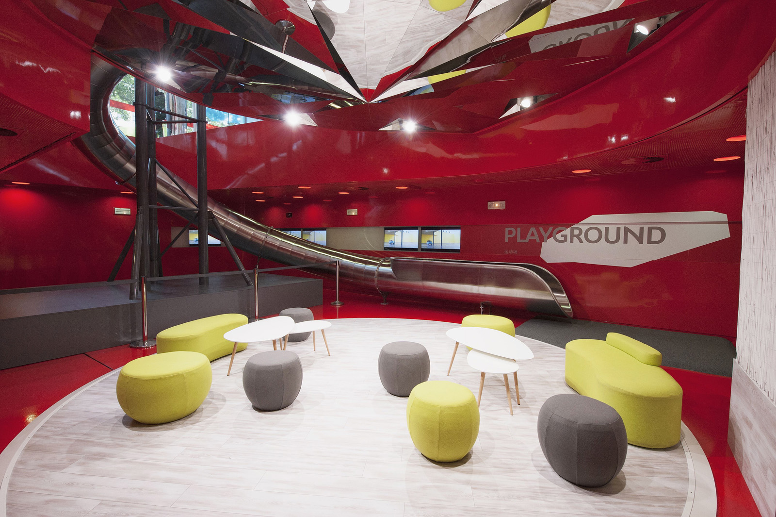 For two euros, visitors can ride the slide, descending at a rate of four meters per second to get from the top floor to the basement in just 15 seconds. At the bottom they’ll also find other games to keep themselves (or their kids) occupied, including a foosball table and a game called Batak, designed to improve hand-eye coordination and used by Citroën Racing drivers to hone their skills.