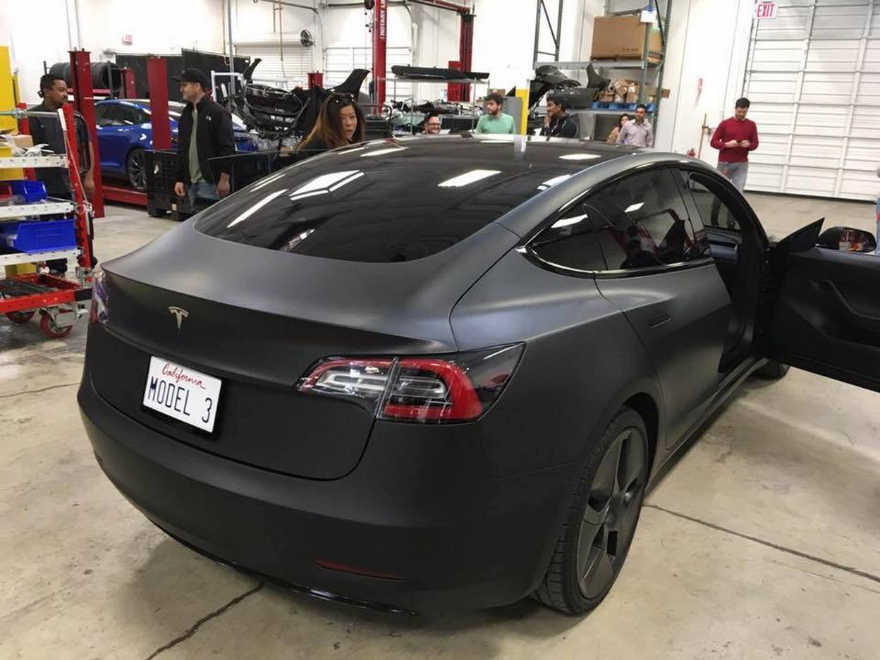 A few days after a matte black Tesla Model 3 was filmed out in the open, another development prototype has been nabbed, this time, in pictures standing in front of a Nissan Leaf at what appears to be a service center.