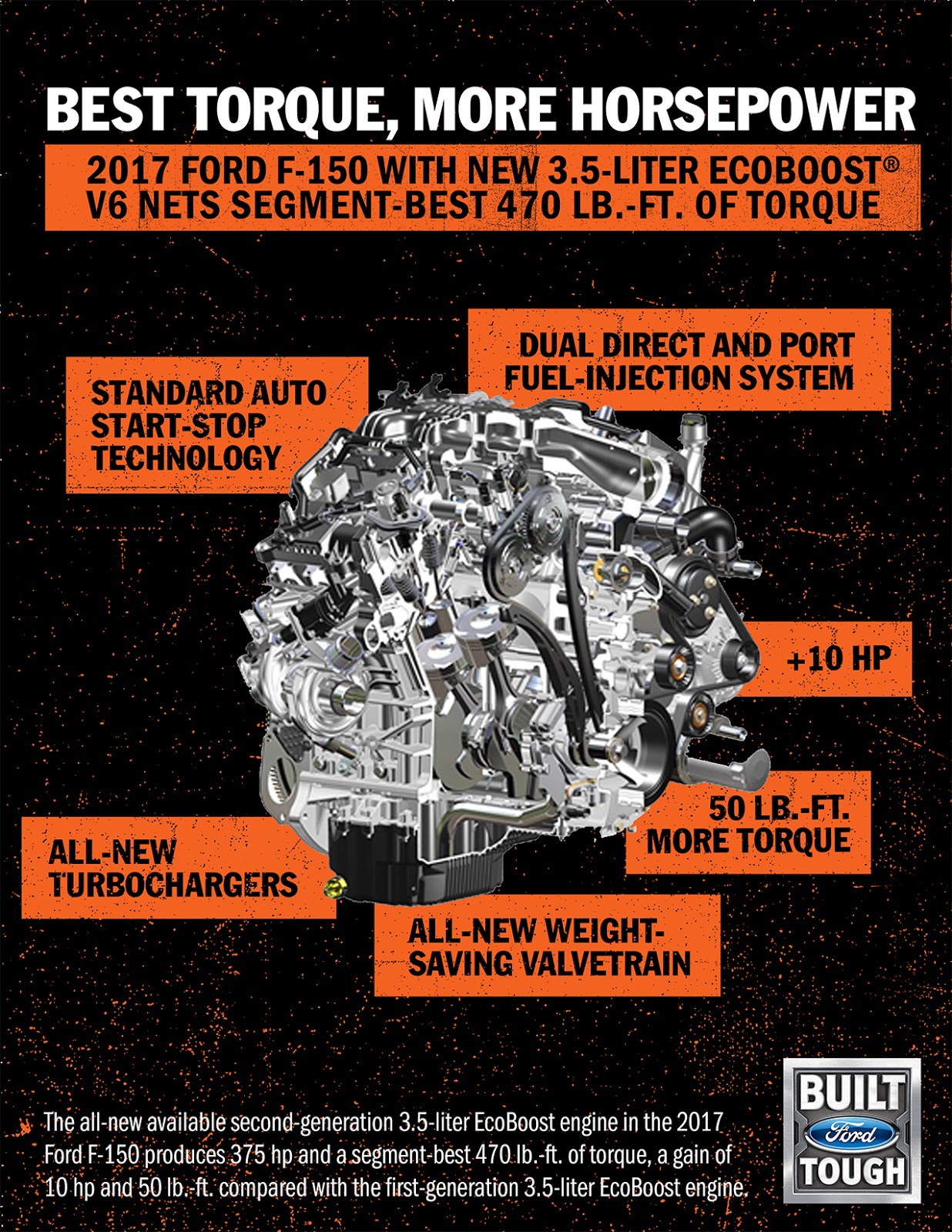 “The 2017 Ford F-150 now delivers the best torque in the segment,” argues Raj Nair, Ford executive VP of product development & CTO. “This class-leading torque arrives with a transformative 10-speed automatic that improves nearly every aspect of F-150 performance.”