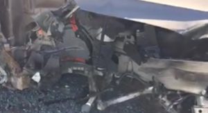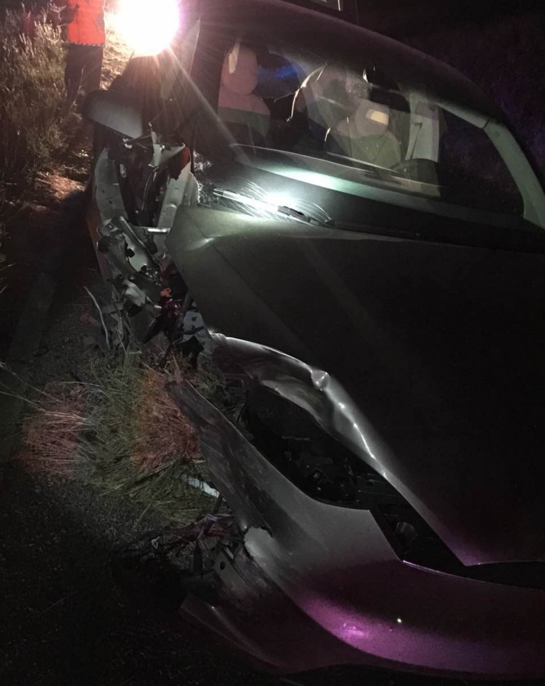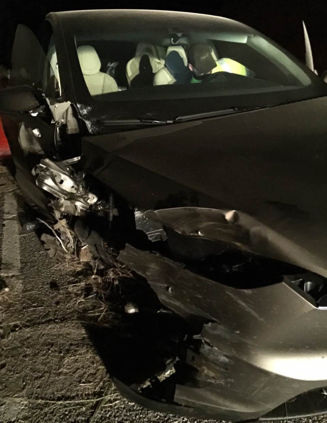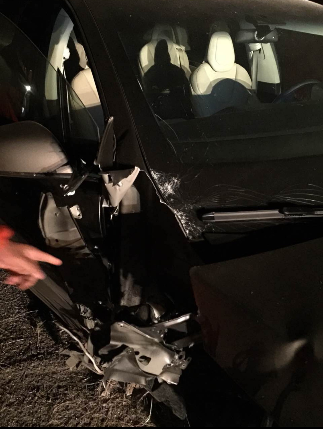 “Both 2 people on car survived,” he said. “It was late at night, Autopilot did not detect a wood stake on the road, hit more than 20 wood stakes, tire on front passenger side and lights flyed away. The speed limit is 55, he was driving 60 on autopilot. His car is completely destroyed. The place he had accident does not have cellphone signal, it is 100 miles from the hotel. We are on a 50 people Wechat messenger group. I woke up today saw he managed to get internet to ask people in the Wechat group to call tesla for assistant.”