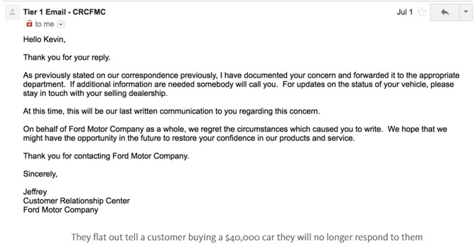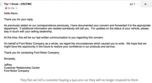 “At this time, this will be our last written communication to you regarding this concern,” said somebody named Jeffrey, working in Ford’s customer relationship center.